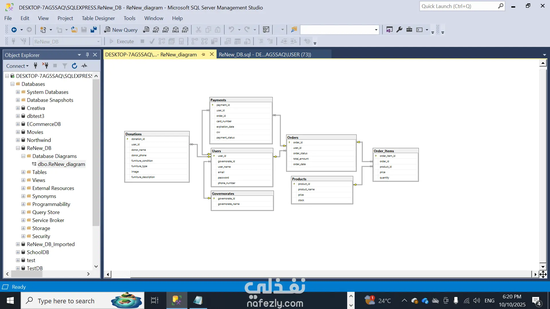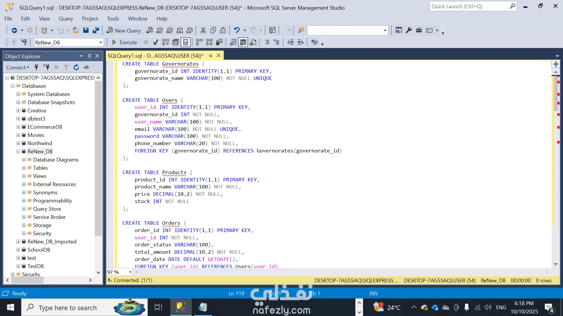 إنشاء الجداول (Tables) مع تحديد المفاتيح الأساسية (Primary Keys) والعلاقات (Foreign Keys).