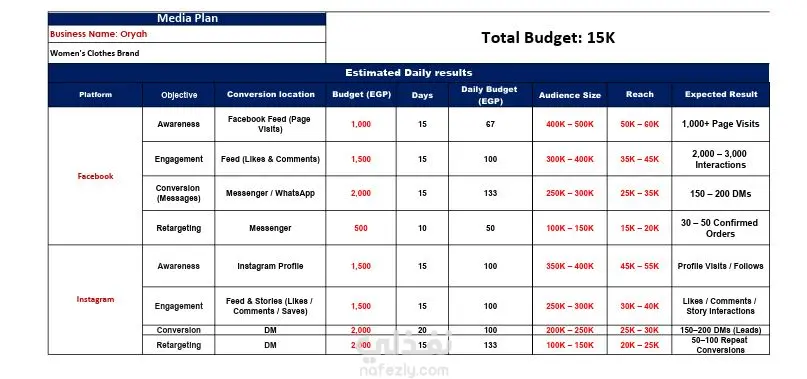 قمت بإعداد خطة وسائط إعلانية متكاملة لعلامة الملابس النسائية Oryah بهدف زيادة الوعي بالعلامة وتحقيق تفاعل فعّال مع الجمهور المستهدف. شملت الخطة اختيار المنصات الرقمية المناسبة مثل فيسبوك وإنستجرام، مع تحديد الأهداف التسويقية للحملات (Awareness – Engagement – Conversion). تم تصميم الخطة باستخدام Microsoft Excel اعتمادًا على بيانات واقعية من Meta Business Suite، وتم تحديد الجمهور المستهدف بناءً على الفئة العمرية والموقع والاهتمامات. كما تم توزيع الميزانية الإجمالية البالغة 15,000 جنيه مصري على الحملات المختلفة، مع تحديد المدة اليومية، والنتائج المتوقعة، ومؤشرات الأداء الرئيسية (KPIs) مثل عدد الزيارات والتفاعل ونسبة التحويل. تُظهر هذه الخطة قدرتي على إعداد خطط وسائط قائمة على البيانات تساعد العلامات التجارية على تحقيق أقصى استفادة من ميزانيتها الإعلانية وتوجيه الرسائل إلى الجمهور المناسب في الوقت المناسب.