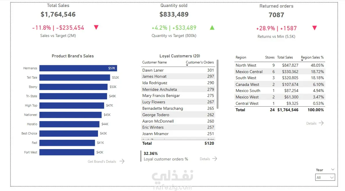 كان الهدف هو تحليل المبيعات لشركة تجزئة باستخدام مجموعة بيانات مقدمة. أولًا تم بتحديد الاسئلة، التي يمهد الطريق لإنشاء لوحة معلومات غنية بالمعلومات. بعد ذلك، تم تصميم المخطط الأولي (الموك أب) لوضع خطة واضحة. وفي النهاية، تم تنظيف البيانات ونمذجتها استعدادًا لمرحلة التصور البصري، حيث تم إنشاء لوحة المعلومات الاستراتيجية.