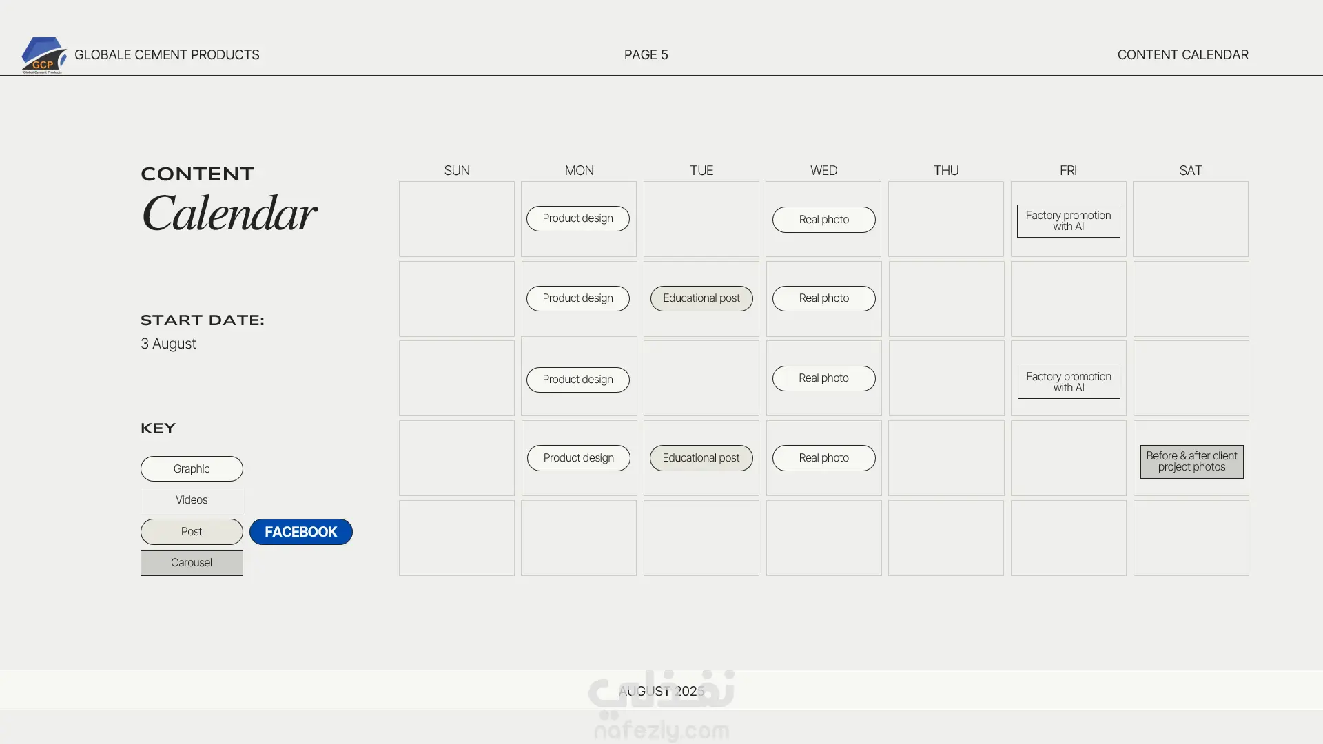تقويم محتوى شهري لمصنع Globle Cement Product – أغسطس 2025 صممت هذا التقويم كجزء من خطة تسويقية متكاملة لمصنع Globle Cement Product، بهدف تنظيم النشر على منصة فيسبوك بطريقة احترافية ومتنوعة. التقويم يشمل توزيع المحتوى على مدار الأسبوع، ويجمع بين: تصميمات منتجات (Product Design) صور واقعية من المصنع (Real Photos) منشورات تعليمية (Educational Posts) فيديوهات ترويجية للمصنع (Factory Promotion Videos) تحضير لاجتماعات مشاريع مستقبلية تم تصنيف المحتوى حسب نوعه (جرافيك – فيديو – بوست – كاروسيل)، لضمان تنوع الأسلوب وتحقيق تفاعل أكبر مع الجمهور المستهدف. ️ هذا النموذج يعكس قدرتي على: إعداد خطط محتوى شهرية متناسقة الدمج بين الهوية البصرية والرسائل التسويقية تقديم محتوى صناعي احترافي يناسب طبيعة المصنع والجمهور