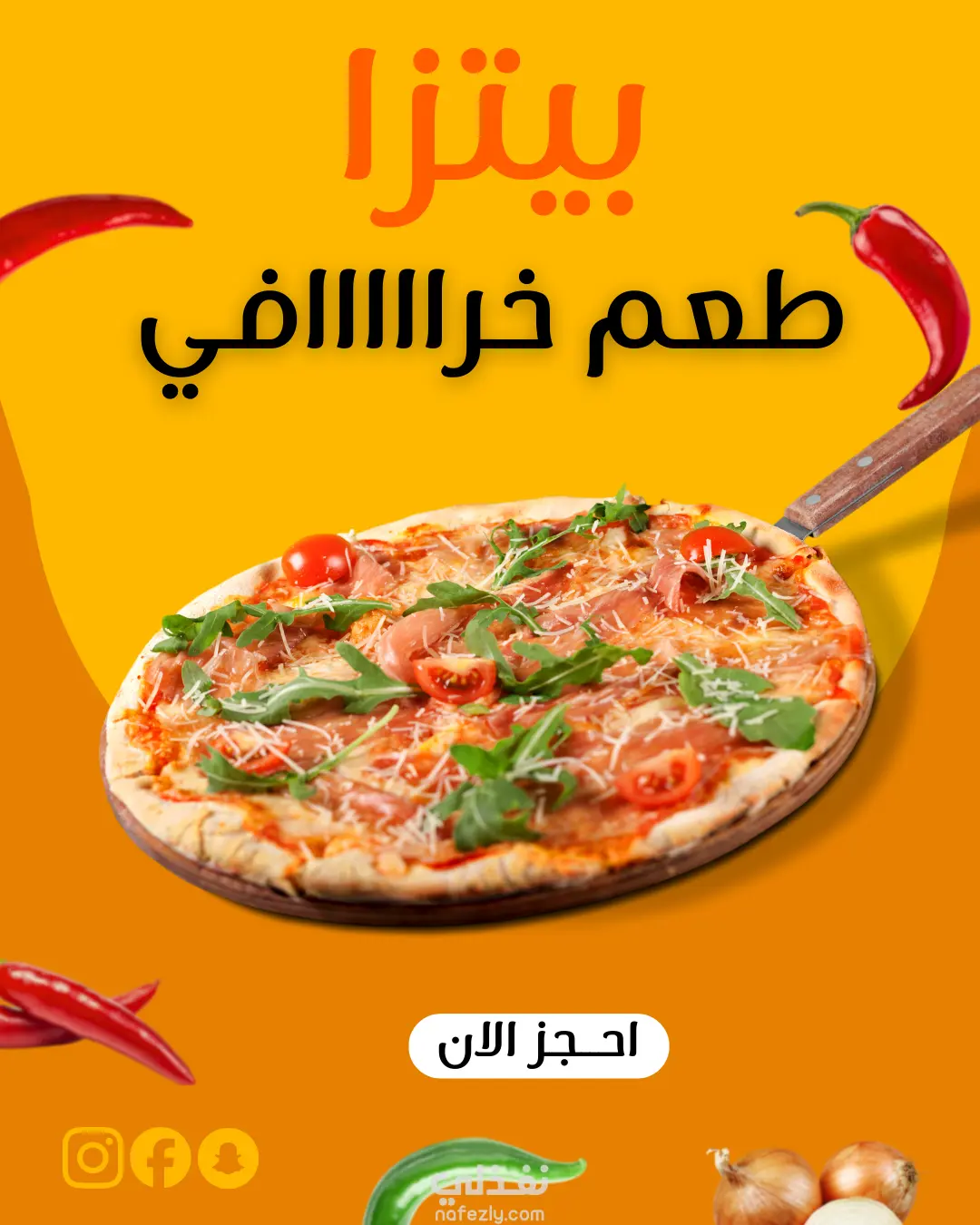 تصميم إعلان احترافي لعرض منتج البيتزا بأسلوب عصري وجذاب، مع إبراز الطابع الشهي والحار للمنتج. يشمل العمل: تصميم بوستر إعلاني احترافي بجودة عالية إظهار البيتزا بشكل واقعي مع إضافة تأثيرات تجعلها تبدو شهية وجذابة استخدام ألوان دافئة وحيوية تعكس الطابع الغذائي (البرتقالي والأحمر) دمج عناصر خضار وفلفل حار لإبراز المذاق المميز كتابة عناوين قوية ولافتة بخط عربي واضح إضافة زر دعوة لاتخاذ إجراء (CTA) مثل: احجز الآن جاهز بالكامل للنشر على السوشيال ميديا أو الطباعة التصميم مناسب للمطاعم، حملات العروض، الإعلانات الرقمية، ومنشورات التواصل الاجتماعي.
