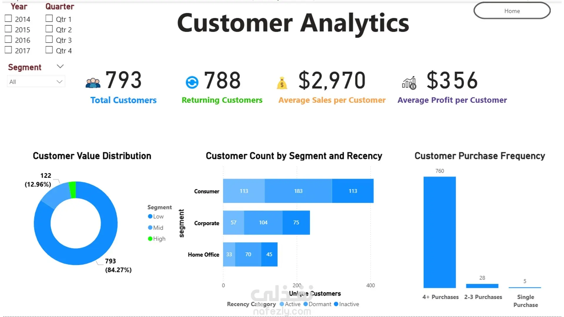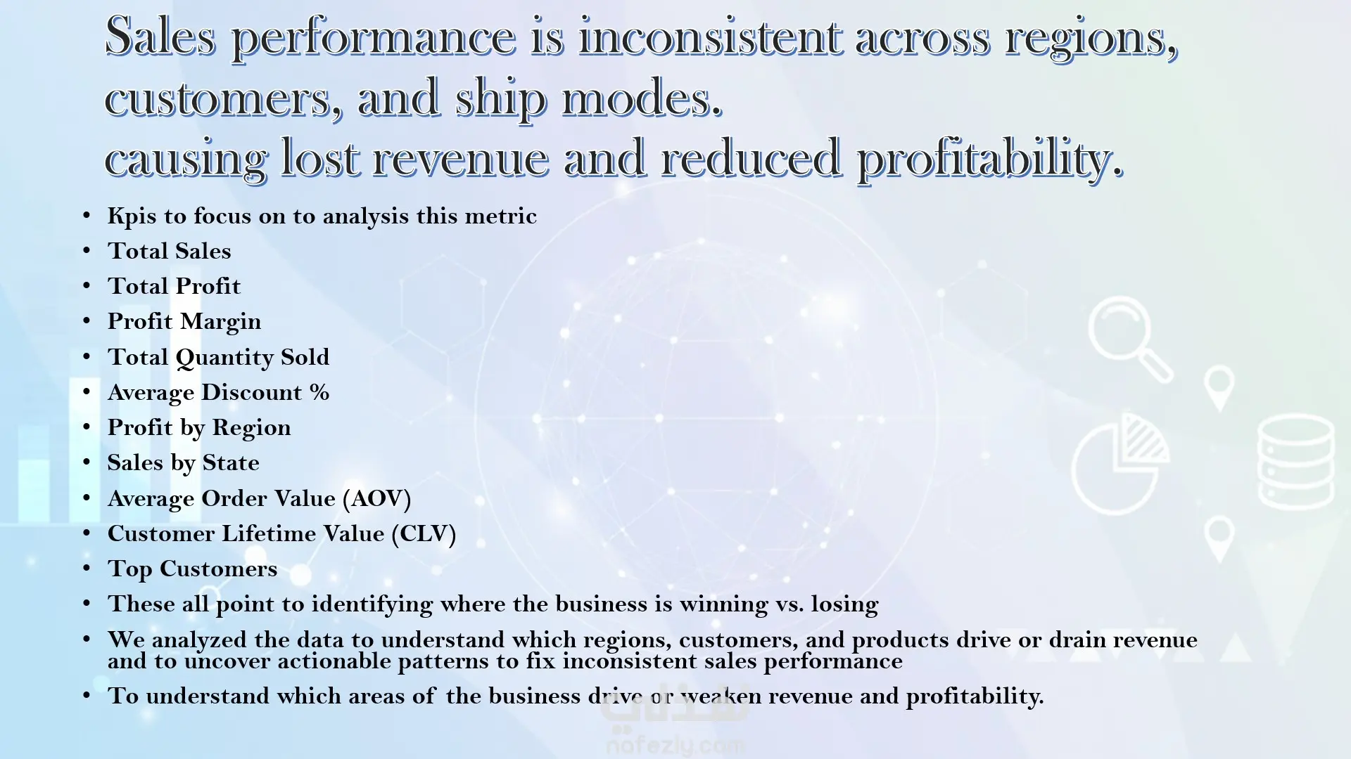 المشروع قدّم Insights عملية زي تحديد المنتجات قليلة الربحية، اكتشاف المناطق المحتاجة تحسين، وتحليل شرائح العملاء الأكثر قيمة. النتيجة كانت لوحة تنفيذية جاهزة تساعد الإدارة في تحسين المبيعات وتقليل التكاليف.