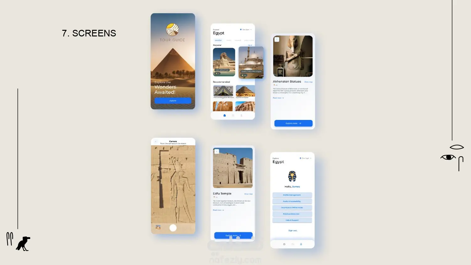 صممت واجهات مستخدم كاملة على Figma لتطبيق Tour Guide الذي يتيح للسياح استكشاف المعالم المصرية عبر تقنية التعرف على الأشياء. شملت التصميمات الـ Wireframes، UI، Prototyping، وDesign System متكامل يضمن تجربة بصرية بسيطة وسهلة للمستخدمين من مختلف اللغات. 🎯 الهدف من التجربة إنشاء تطبيق يجعل السائح يستكشف الآثار بطريقة حديثة عبر Object Recognition + AR-like experience من خلال الواجهة التي قمت بتصميمها على Figma. الهدف هو جعل المعلومات التاريخية أكثر تفاعلية وسهولة، ودعم السياحة المصرية بعد التحديات الأخيرة. ✨ ما يميز التصميم ألوان مستوحاة من الهوية المصرية القديمة ولكن بروح عصرية. تصميم بسيط، منظم، وسهل التصفح للسائح الأجنبي. التركيز على الصور والرسوم التوضيحية لتسهيل الفهم بدون نصوص طويلة. تجربة بصرية تساعد السائح على "التعلم من خلال الاكتشاف".