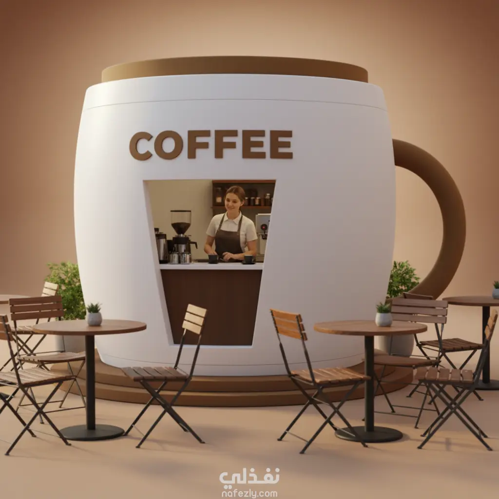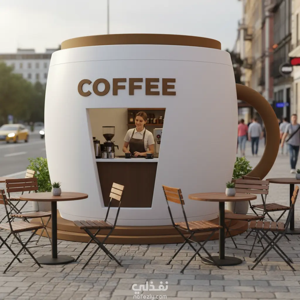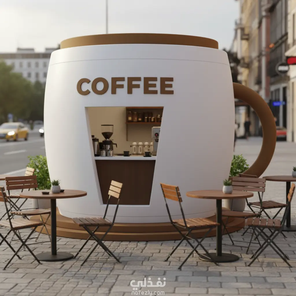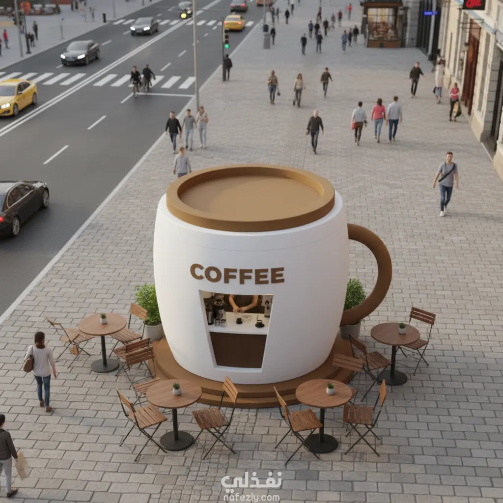شكل الكشك: مجسّم على هيئة فنجان قهوة ضخم يمنح المشروع بصمة قوية وسط أي بيئة، ويشدّ الانتباه من مسافة كبيرة.