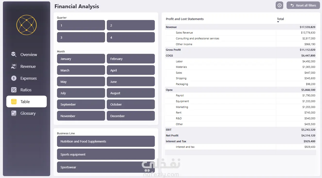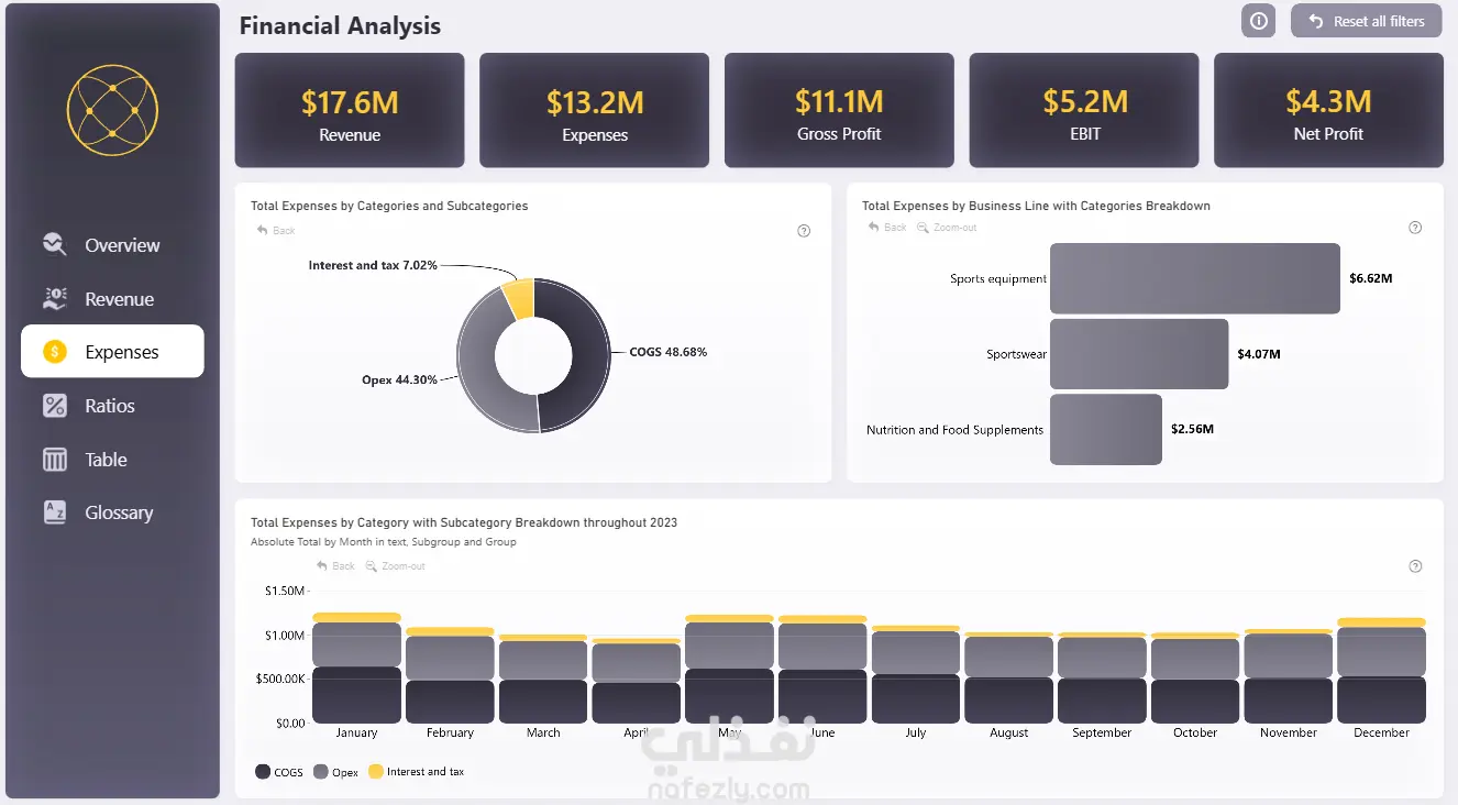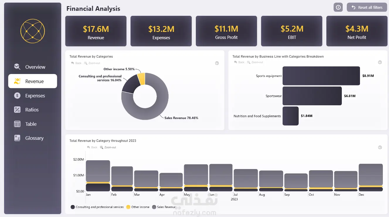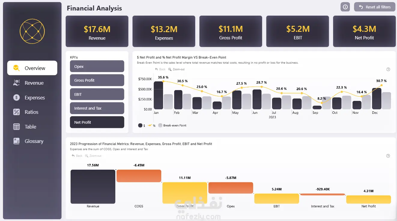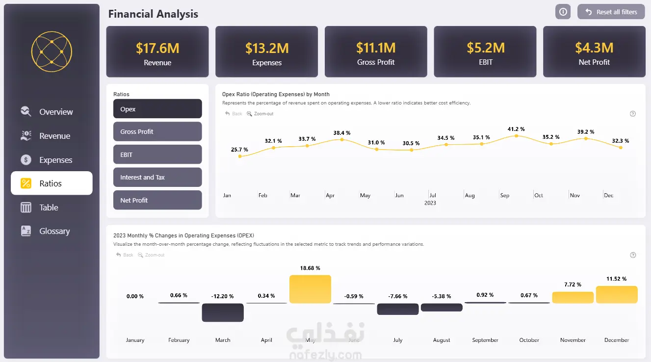 لوحة المعلومات مُقسّمة إلى عدة أقسام: نظرة عامة - عرض شامل الإيرادات - تحليل الإيرادات المصروفات - تحليل المصروفات النسب - المؤشرات المالية الجدول - البيانات المالية التفصيلية المسرد - المراجع والتعريفات