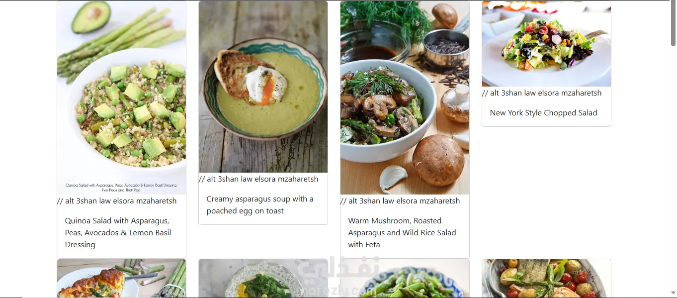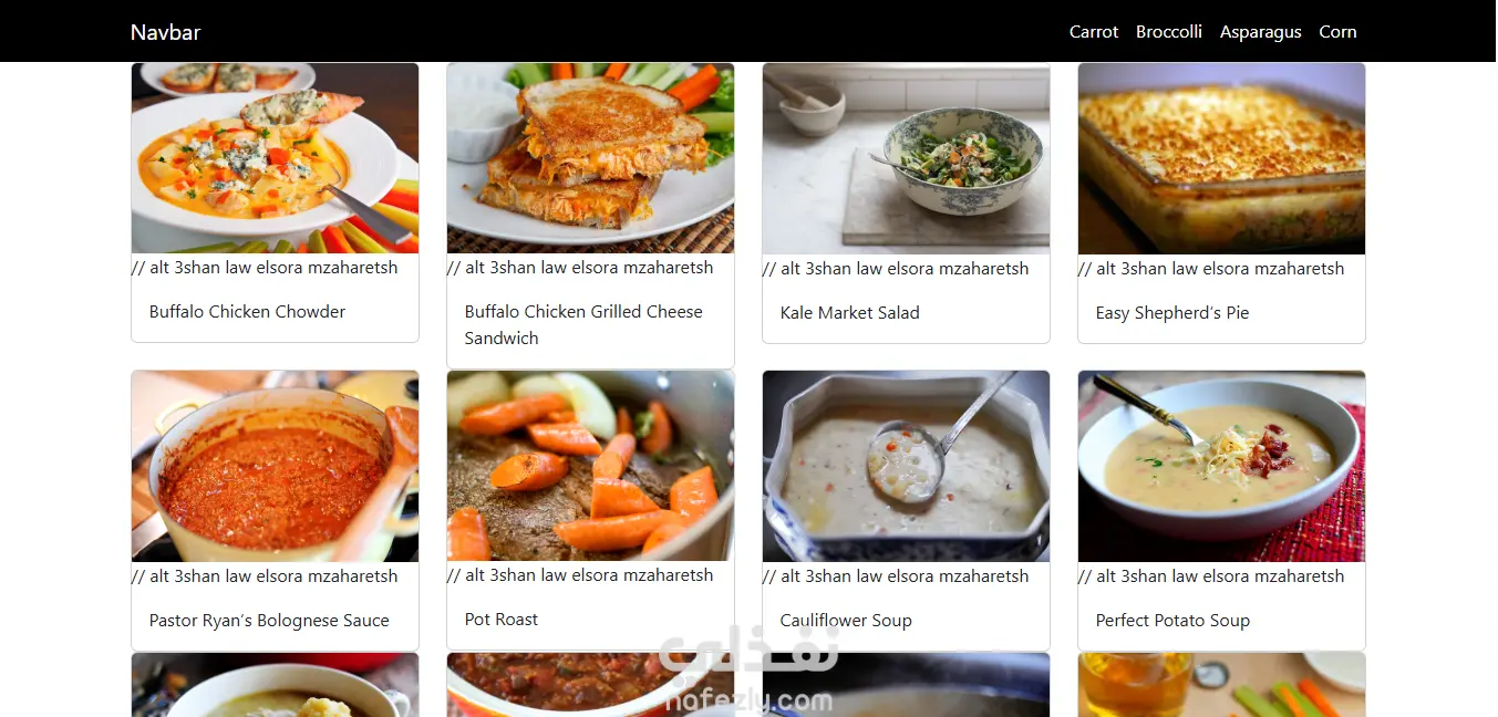 هذا المشروع هو موقع ويب بسيط للطعام تم بناؤه باستخدام HTML وCSS وBootstrap وJavaScript. يعرض الموقع أنواعًا مختلفة من الأطعمة، منظمة من خلال شريط تنقل يحتوي على فئات مثل الجزر، البروكلي، الهليون، والذرة. عند اختيار أي فئة، تعرض الصفحة مجموعة من بطاقات الطعام، تحتوي كل بطاقة على صورة وعنوان ووصف قصير. التصميم متجاوب بالكامل باستخدام Bootstrap، ويركز على التنظيم الواضح، والمرئيات الواضحة، والتنقل السلس، دون استخدام أي API أو وظيفة بحث.