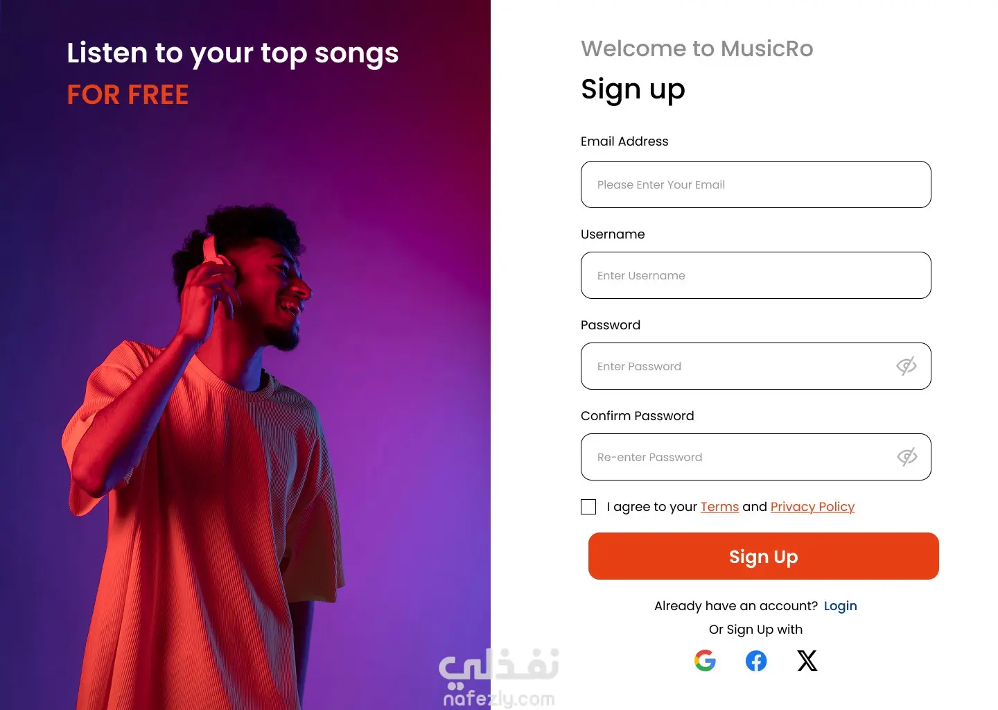 تصميم واجهة إنشاء حساب (Sign Up) لتطبيق موسيقى عصري
