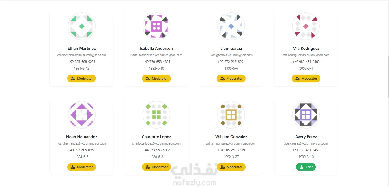 كل بطاقة تحتوي على: صورة الملف الشخصي، الاسم، البريد الإلكتروني، رقم الهاتف، تاريخ الميلاد، ودور المستخدم.