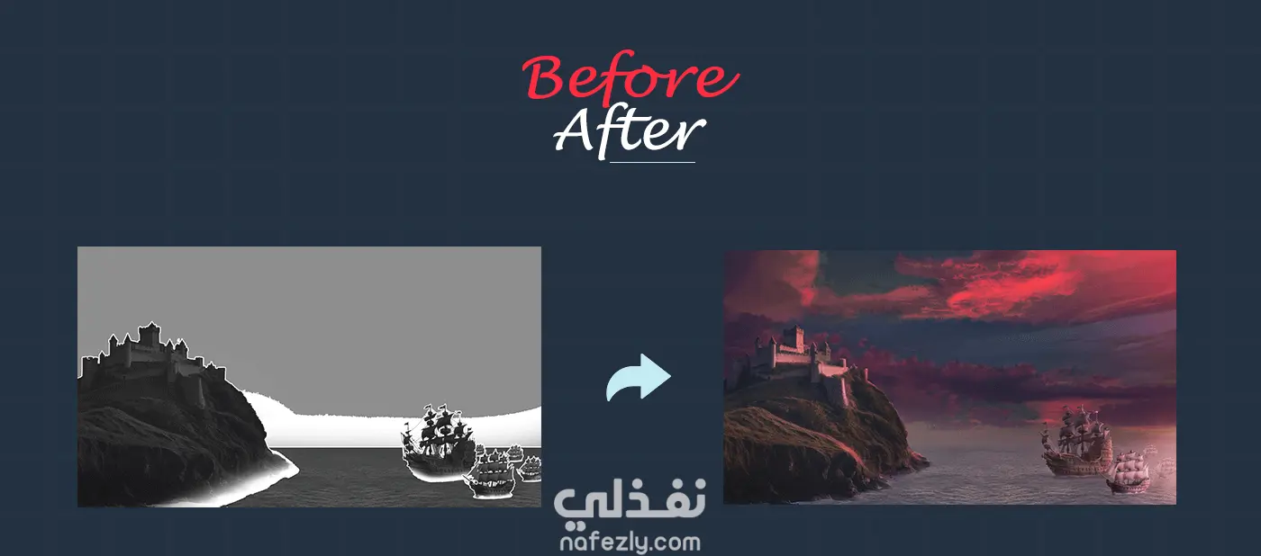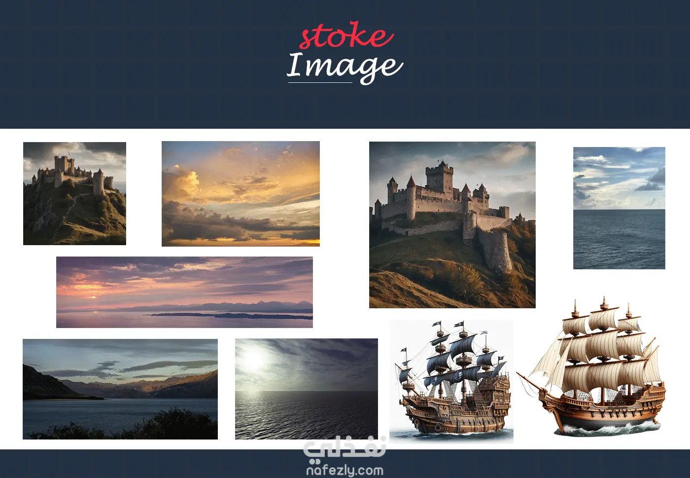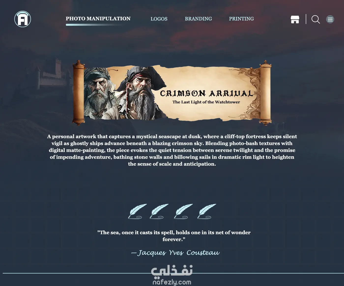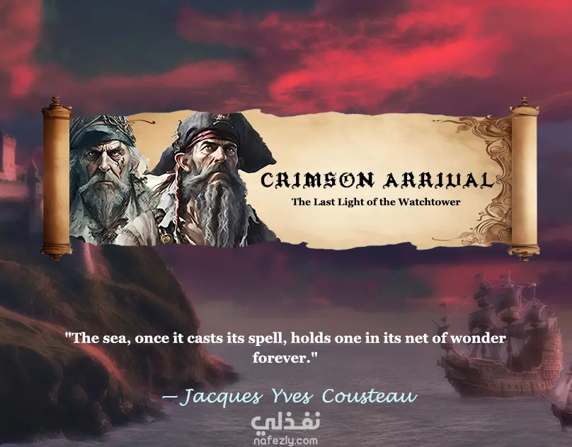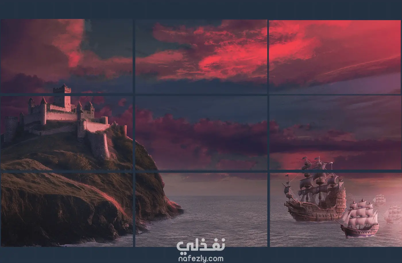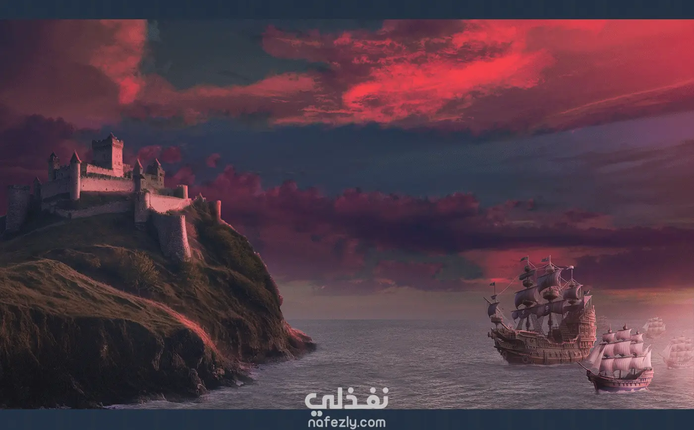 عمل فني رقمي عالي الدقة بأسلوب الفانتازيا، يجمع بين قلعة شامخة مبنية على جرف صخري مطل على البحر وسفن شراعية ضخمة تبحر في الأفق تحت سماء غامرة بدرجات البنفسجي والأحمر.