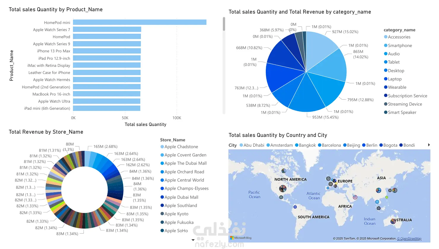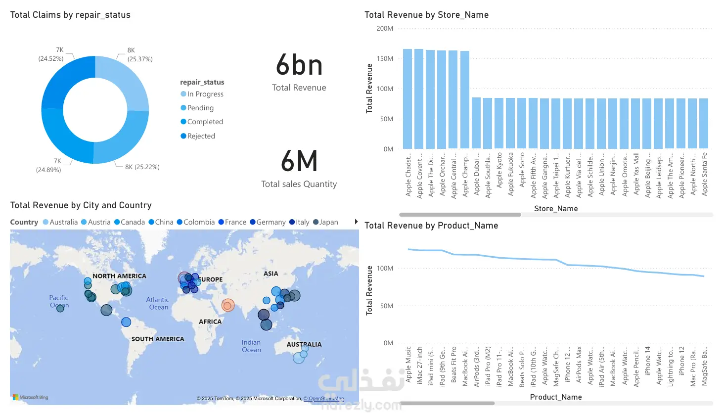 قمت بتنفيذ مشروع متكامل لتحليل بيانات مبيعات شركة Apple بهدف استخراج رؤى واضحة تدعم اتخاذ القرارات وتحسين أداء المبيعات. المشروع شمل بناء لوحة تحكم تفاعلية (Interactive Dashboard) تعرض أهم المؤشرات بطريقة مبسّطة وسهلة الفهم. أهم عناصر التحليل الموجودة في لوحة التحكم: 1. تحليل حالة إصلاح الأجهزة (Repair Status) عرض إجمالي المطالبات حسب حالة الإصلاح: قيد التنفيذ، معلّق، مكتمل، مرفوض. توزيع الحالات بطريقة بصرية توضح نسبة كل حالة من إجمالي الإصلاحات. 2. تحليل الإيرادات والمبيعات حسب المتاجر (Store Performance) مقارنة إجمالي الإيرادات بين مختلف متاجر Apple حول العالم. تحديد أعلى المتاجر من حيث الإيرادات وأقلها أداءً بشكل سريع. 3. تحليل الإيرادات حسب المدن والدول خريطة تفاعلية توضح الإيرادات في كل دولة ومدينة. تسهيل فهم توزيع المبيعات عالميًا وتحديد المناطق الأكثر ربحًا. 4. تحليل الإيرادات حسب المنتجات (Product Revenue) عرض إجمالي الإيرادات لكل منتج مثل: iPhone, MacBook, iPad, Apple Watch وغيرها. تحديد المنتجات الأكثر مبيعًا وتأثيرها على إجمالي الإيرادات. 5. تحليل كمية المبيعات حسب المنتج (Sales Quantity) مقارنة كمية المبيعات بين المنتجات المختلفة. إبراز المنتجات الأعلى طلبًا مثل HomePod mini و Apple Watch. 6. تحليل المبيعات حسب الفئة (Category Analysis) تقسيم المبيعات على فئات مثل: الهواتف، الأجهزة اللوحية، الساعات الذكية، ملحقات Apple وغيرها. معرفة نسبة مساهمة كل فئة في إجمالي الأرباح. التقنيات المستخدمة Power BI لإنشاء التقارير ولوحات التحكم. تحليل بيانات شامل باستخدام أدوات التصفية والتجميع. تمثيل بيانات تفاعلي متقدم باستخدام الخرائط والرسوم البيانية المتنوعة.