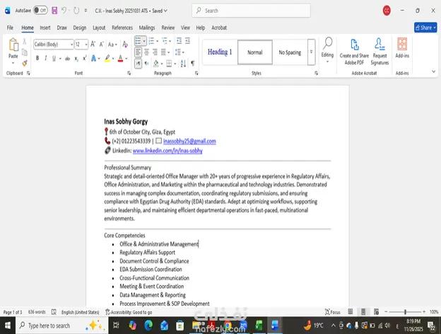 إدارة الملفات والمستندات • إعداد وتهيئة ملفات Word أو PDF بشكل احترافي. • مراجعة وتنسيق العقود، ,العروض • تنظيم ملفات الشركات، وترتيب البيانات