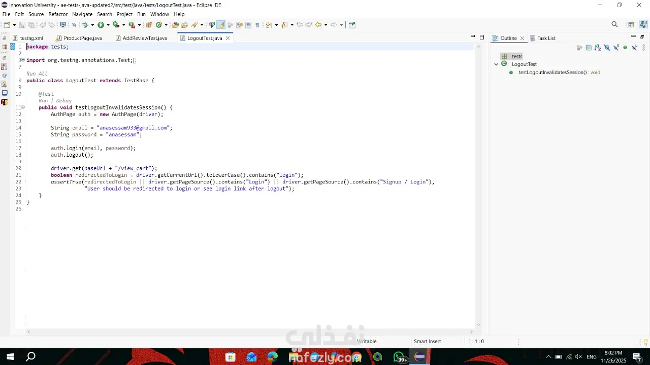 Logout: اختبار عملية تسجيل الخروج والتأكد من إنهاء الجلسة بشكل صحيح.