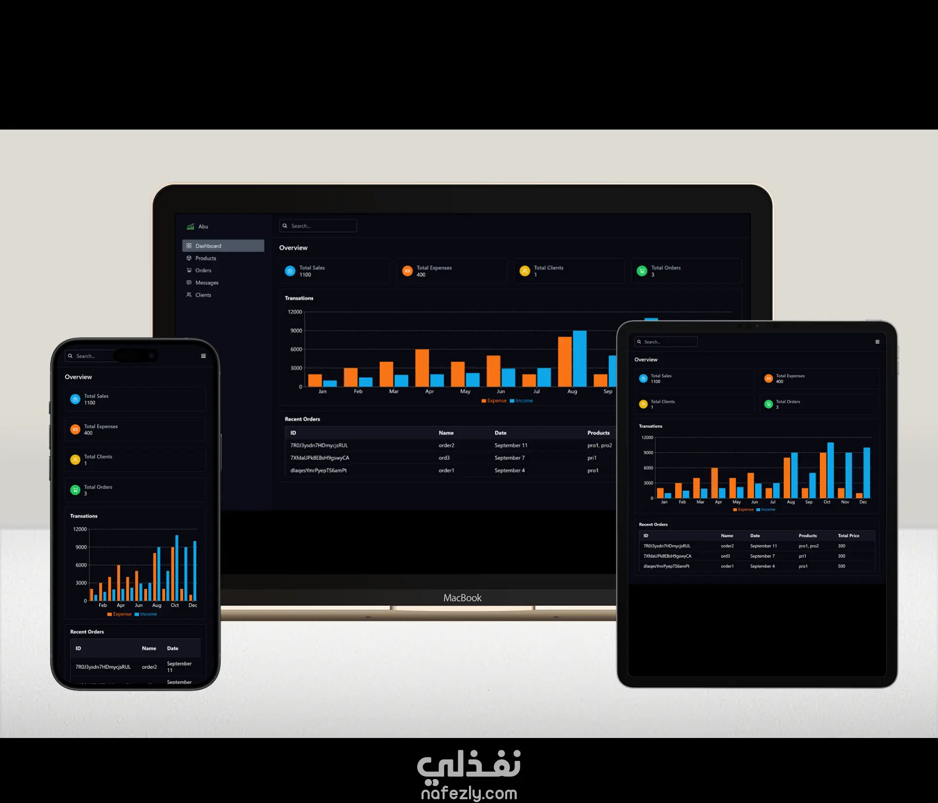 لوحة تحكم (Dashboard) تفاعلية قمت بتطويرها باستخدام React.js، تهدف إلى إدارة المنتجات والعملاء والطلبات بسهولة وفاعلية.