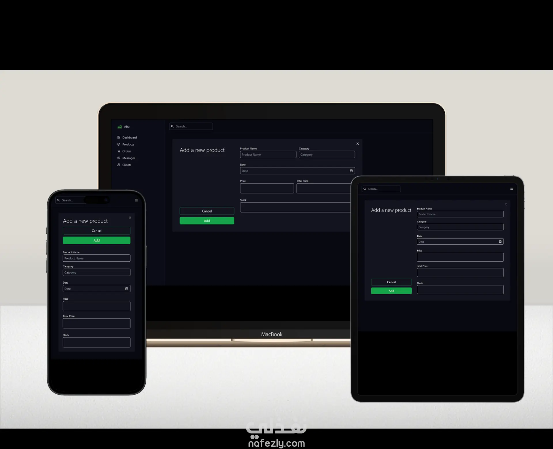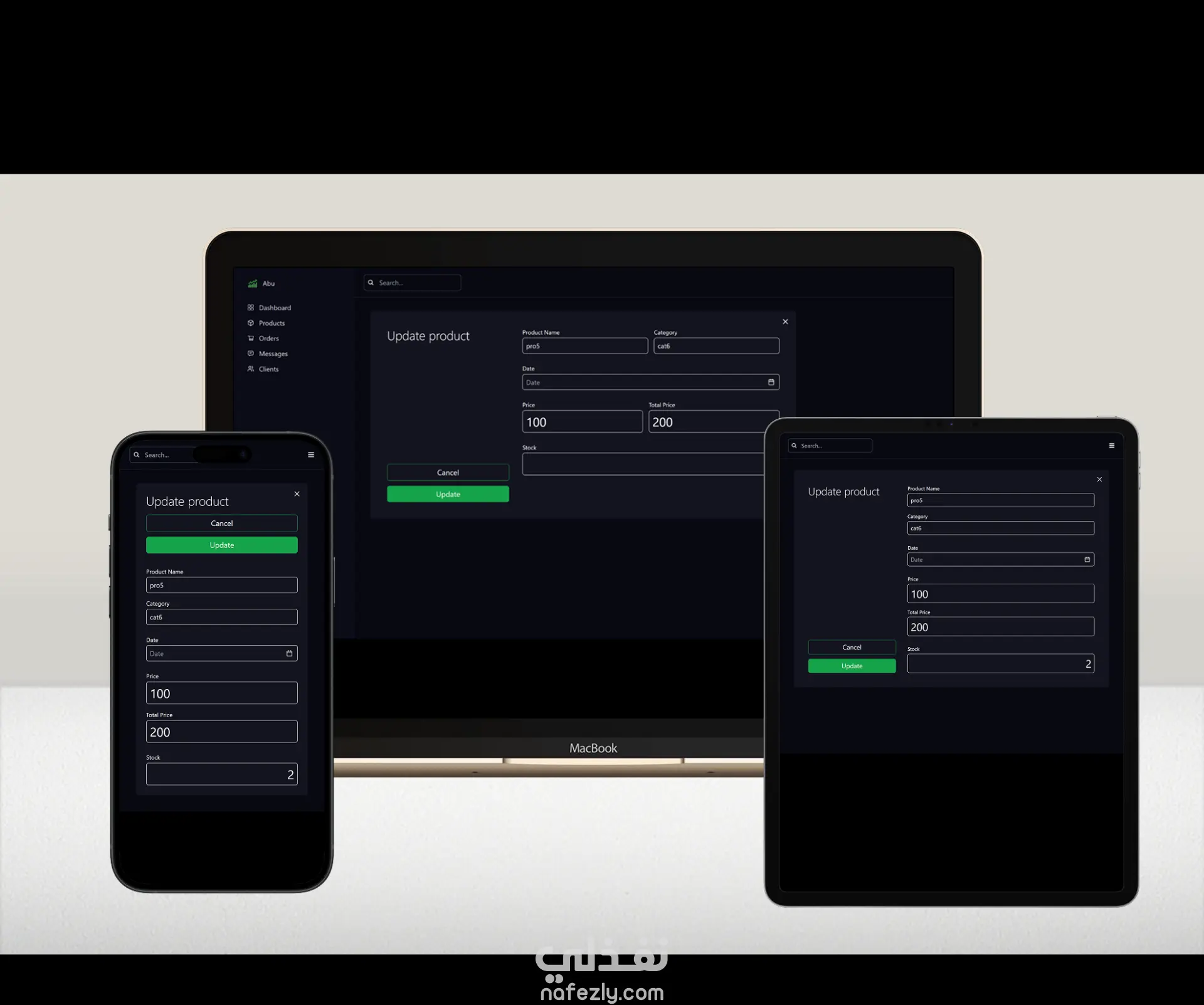 إدارة المنتجات: إمكانية إضافة منتج جديد، تعديل البيانات، أو حذف المنتج.