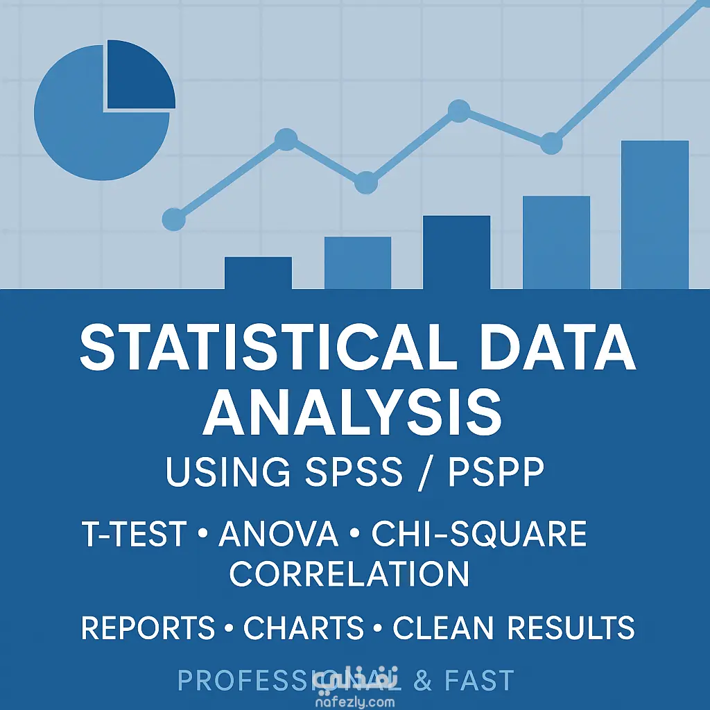 أقدم خدمة تحليل البيانات الإحصائية بشكل احترافي باستخدام برامج SPSS – PSPP – Excel مع خبرة قوية في تنفيذ التحليلات الأكاديمية والبحثية. يشمل العمل: تجهيز وتنظيف البيانات (Data Cleaning). تحليل إحصائي كامل للبيانات. تنفيذ اختبارات الفرضيات (T-test، ANOVA، Correlation، Regression… إلخ). استخراج النتائج بدقة وعرضها في جداول ورسوم بيانية. تفسير النتائج وشرح العلاقات بين المتغيرات. إعداد تقرير شامل جاهز للاستخدام الأكاديمي أو المهني. مناسب للطلاب والباحثين والدراسات السوقية والمشاريع العلمية. جاهز لاستلام ملف البيانات الآن والبدء مباشرة.