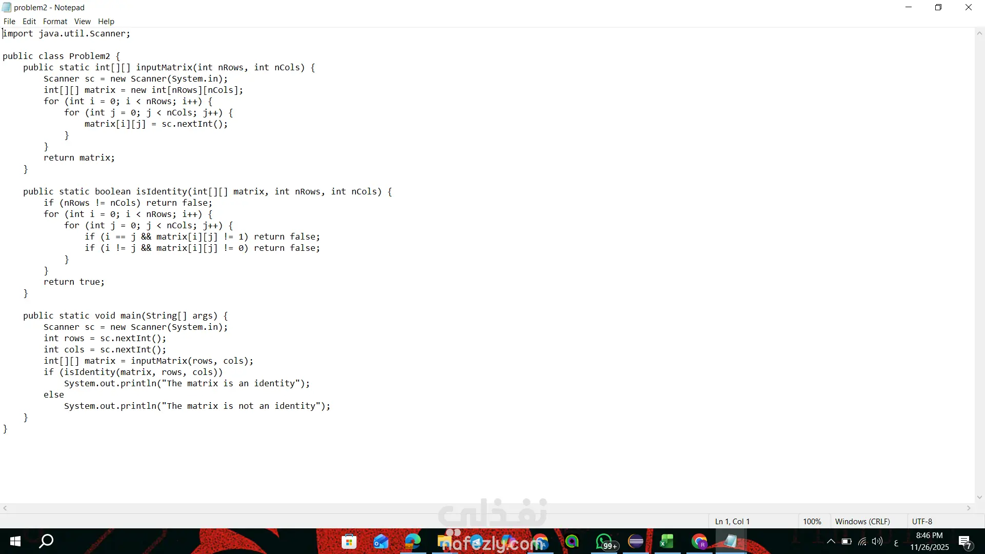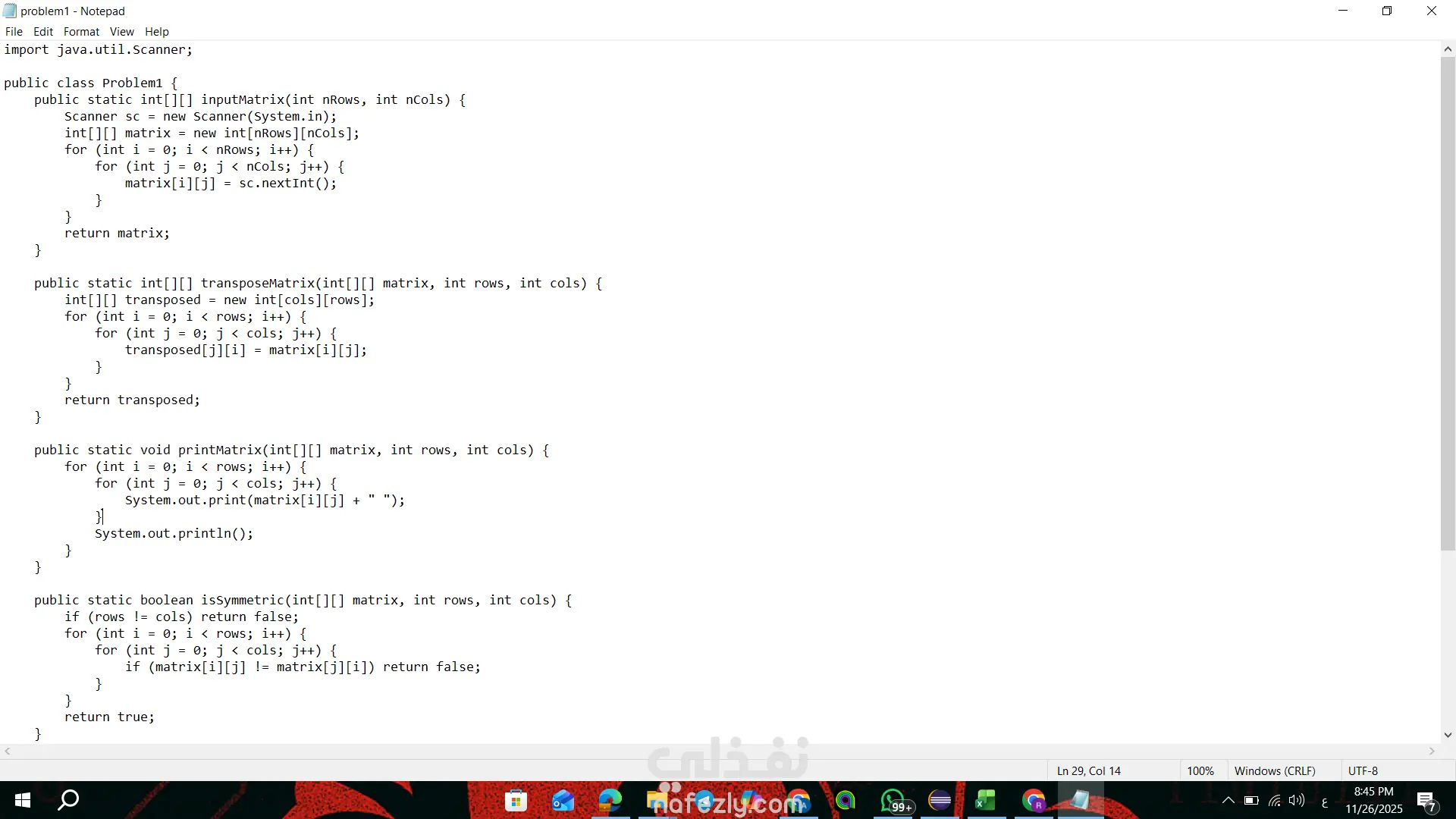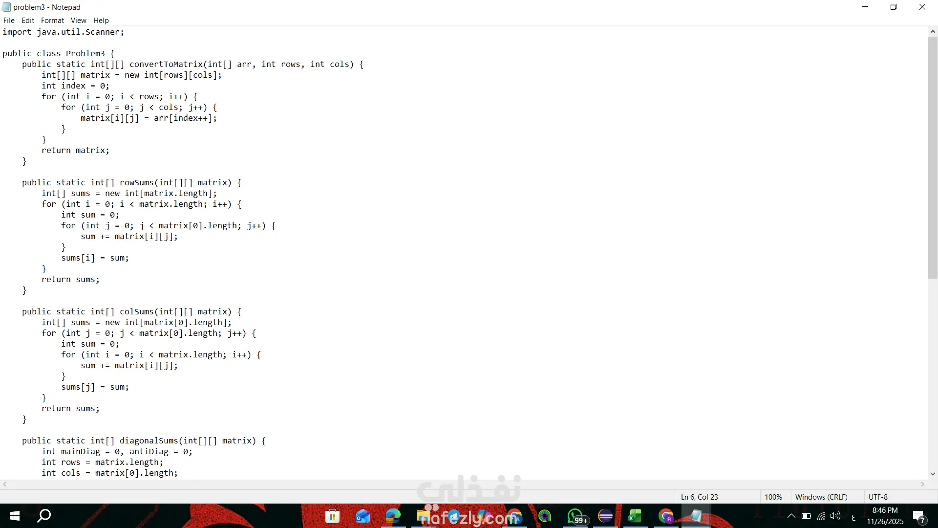 قمت بتطوير برنامج بلغة Java لمعالجة المصفوفات، ويشمل تنفيذ العمليات الأساسية عليها بشكل منظم وفعال. البرنامج يستقبل أبعاد المصفوفة من المستخدم، ثم يقوم بإدخال عناصرها، وبعد ذلك ينفّذ: