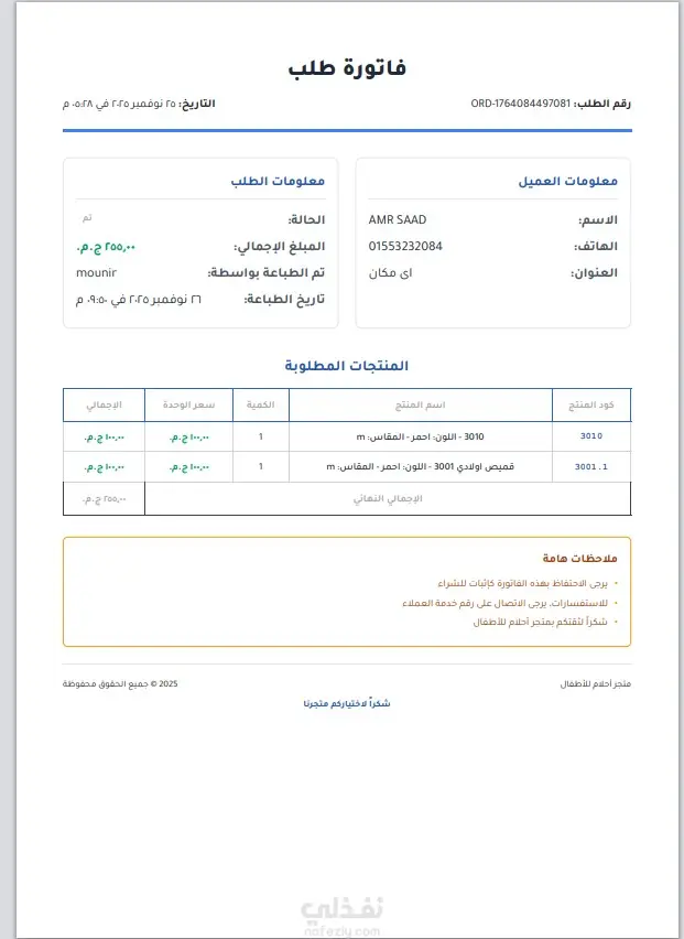 متجر ملابس متكامل ، تصنيف جروبات وانواع ، فيه مميزات كبيرة جدااا ، اولا امكانية سحب المنتجات من برنامج سكاي سوفت الشهير ، وعمل المنتجات بناء على الداتا المتوفرة ، ثانيا امكانية الاضافة من خارج سكاي سوفت زيه زي اي متجر ، ثالثا ودي ميزة كبيرة جدا ، تقدر ترفع صور الموديلات كلها مرة واحدة عن طريق اسمها فقط ، بمعنى انك بترفع الموديلات كلها بدون صور دفعة واحدة لو من سكاي سوفت وايضا دفعة واحدة من اكسيل لو مش بتتعامل مع سكاي سوف المحاسبي ، بعد كدا تبعا لاسم الصورة بترفع الصور كلها دفعة واحدة وكل صورة بتروح تلقائيا امام منتجها حسب اسمها ، ودا موضوع بيوفر وقت طويل جدا في الانشاء ، رابعا ، في داشبورد للادمن ودا طبيعي ، انما ايضا في داشبورد للموظفين عشان الموظف يبقى عارف المتوفر من كل صنف ويقدر ينفذ الاوردرات ، وبيظهر في النهاية للادمن مين اللي نفذ الاوردرات دي ـ كمان في داشبورد للعميل يقدر يطبع اوردراته ويراجعها ، لينك للمتجر https://www.royakids.shop