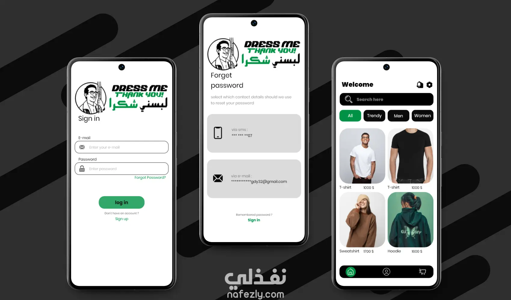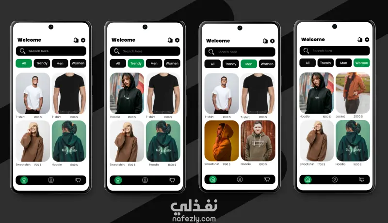 المشروع: تصميم واجهات مستخدم (UI/UX) لتطبيق جوال لمتجر ملابس إلكتروني (E-commerce Mobile App). الهدف: إنشاء تجربة مستخدم سلسة وجذابة لزيادة معدلات التحويل والمبيعات و تصميم لوجو ابداعي يشد انتباه العميل ما تم إنجازه: لقد قمت بتصميم 19 واجهة (موضحة في الصور) تمثل رحلة المستخدم الرئيسية داخل التطبيق، وهي: 1- شاشة (splash screen) 2- شاشة (logo screen) 3- شاشة تسجيل الدخول (Sign In) 4- شاشة تسجيل الدخول (Sign Up) 5- شاشة (code recovery screen) 6- شاشة نسيان كلمة المرور (Forgot Password) 7- الشاشة الرئيسية/استعراض المنتجات (Welcome / Home Screen) 8- شاشة لكل من (All screen -Trendy Screen -Men screen -Women screen) 9- شاشة (Notfication screen) 10- شاشة تسجيل الدخول (Settings) 11- شاشة (Profile screen) 12- شاشة (Change password) 13- شاشة (Shopping cart) 14- شاشة (Removing item from shopping cart) 15- شاشة (Check out screen) 16- شاشة (Payment Methods) 17- شاشة (Order tracking screen) 18- شاشة (that order has been requested) 19-شاشة (Checkout when shopping cart is empty) تصميم واجهة مستخدم حديثة وجذابة. إبراز شريط البحث "Search here" لتسهيل عملية العثور على المنتجات. وجود فلاتر وتصنيفات علوية واضحة (All, Trendy, Man, Woman). --------------------------------------------------------------------------------------------------------------------------------------------------------- عرض المنتجات (T-shirt, Sweatshirt, Hoodie) ببطاقات جذابة تتضمن: -صورة واضحة للمنتج. -اسم المنتج. -السعر (مع إبرازه). -شريط تنقل سفلي واضح ومناسب لتطبيقات التجارة الإلكترونية (Home, Profile, Cart, etc.). -الخصائص والمميزات الرئيسية في التصميم: -هوية بصرية مميزة: استخدام لوحة ألوان ثنائية (أسود وأخضر) لإنشاء مظهر عصري وجريء يعكس هوية المتجر. -سهولة الاستخدام (UX): التركيز على التنقل السهل والواضح عبر جميع الشاشات. -تصميم متجاوب (Responsive Design): الواجهات مصممة بشكل احترافي لتناسب شاشات الجوال المختلفة. -تركيز على التحويل: تصميم بطاقات المنتجات بأسلوب يشجع على التفاعل والشراء. أدوات العمل المستخدمة: [اذكر الأدوات التي استخدمتها، مثل: [illustrator , Figma , Adobe XD , Sketch]