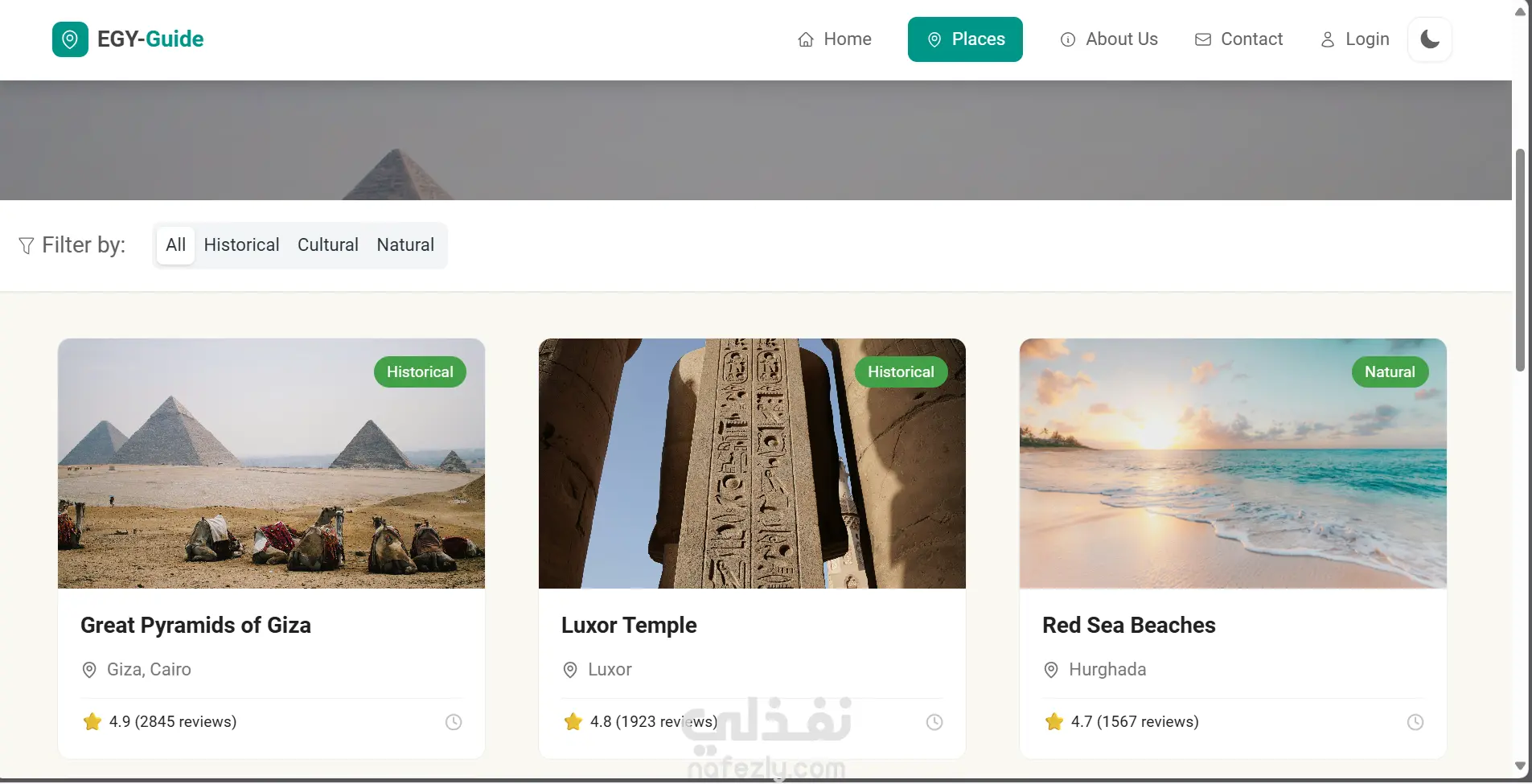 Based on the provided code structure and the screenshots, this application is a **Travel and Destination Booking Platform** specializing in Egyptian sites. ## 🌟 Egypt Exploration & Booking Platform Discover the majesty of ancient and modern Egypt with this dedicated travel platform. **Explore Destinations** allows users to filter historic, cultural, and natural wonders of Egypt, from the Great Pyramids of Giza to the serene Nile River Cruises. Each destination card provides compelling details, a professional image, and user reviews, encouraging immediate engagement. The core functionality centers on a seamless **Book Now** experience. Clicking the button navigates the user to a dedicated **Checkout** page, which instantly loads the chosen trip's details, including the dynamic title, image, and location. The robust checkout form enables users to easily select ticket quantity, dynamically updating the **Order Summary** with calculated totals (ticket price plus service fee). Users proceed by inputting contact and payment information (supporting credit card and digital wallet options), ensuring a secure and efficient path to confirming their Egyptian adventure. The site features a clean, responsive design supporting both light and dark modes.