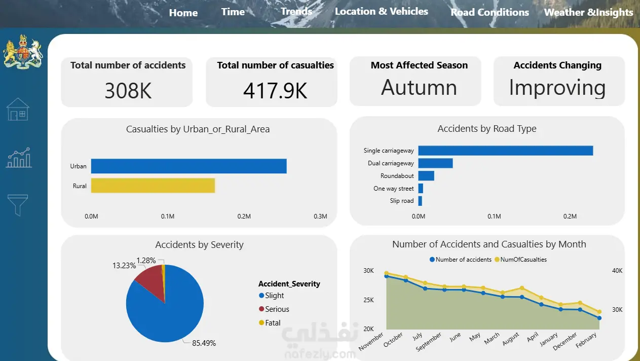 استخدمت Power BI لتحليل أكثر من 300 ألف سجل حادث، وطلعت برؤى مهمة عن الأسباب اللي بتؤثر على خطورة الحوادث: