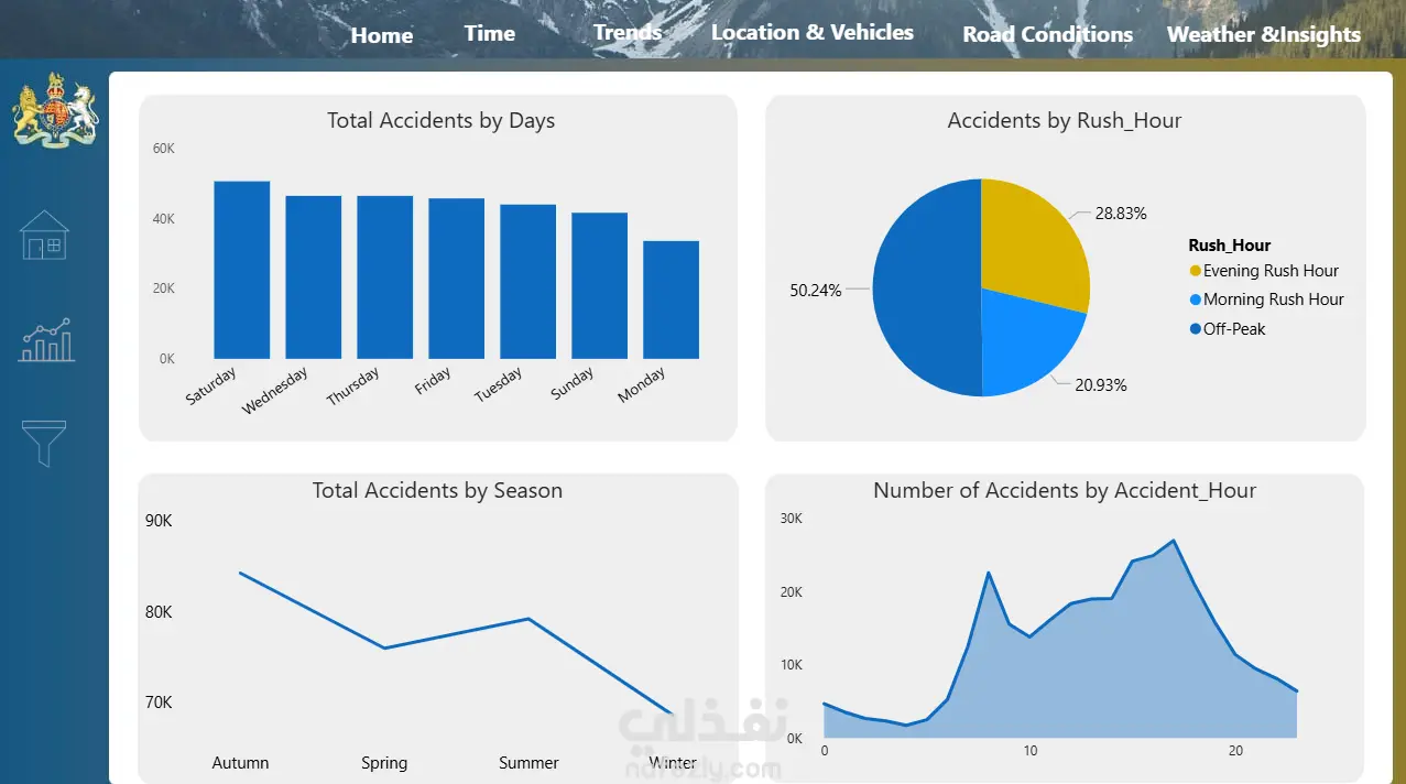 التوقيت – ساعات الذروة والمواسم (الخريف الأسوأ) وأيام الأسبوع كانت مؤثرة جدًا في معدل الحوادث.