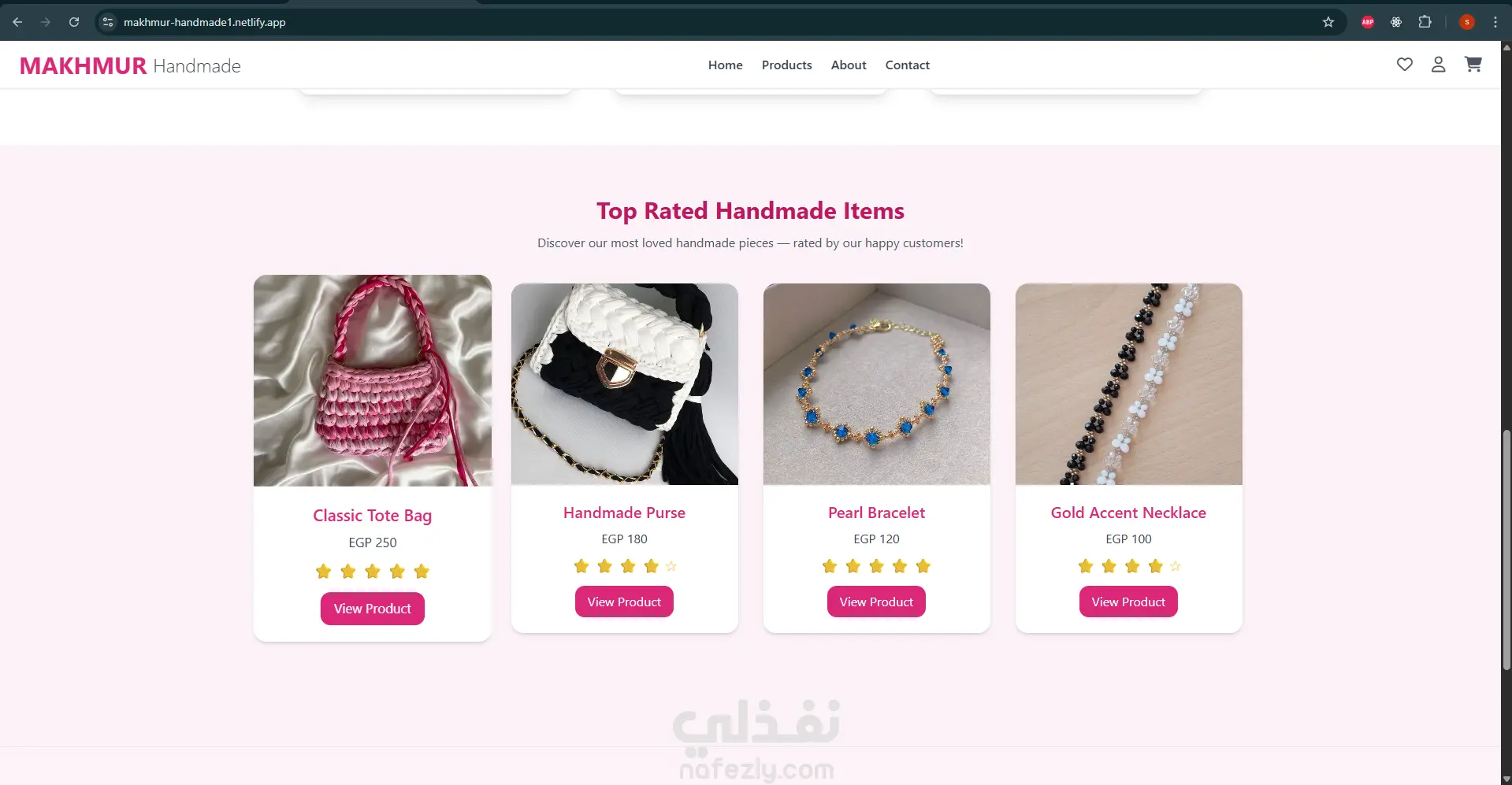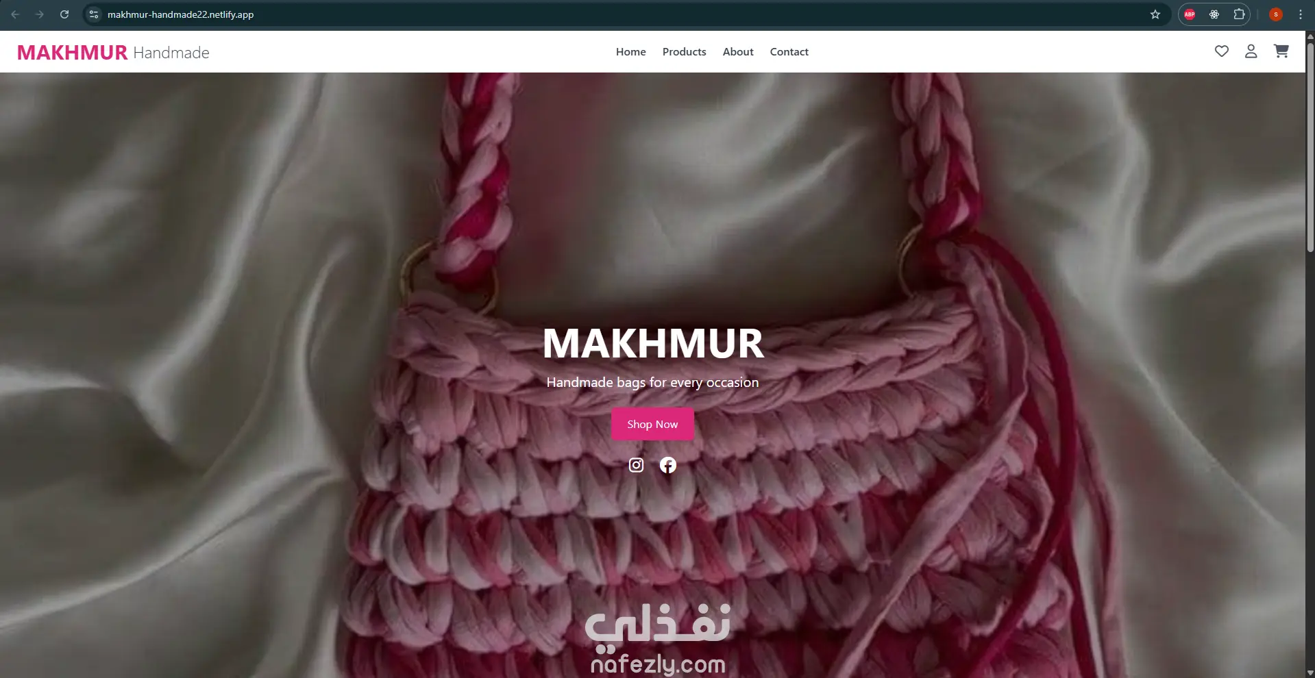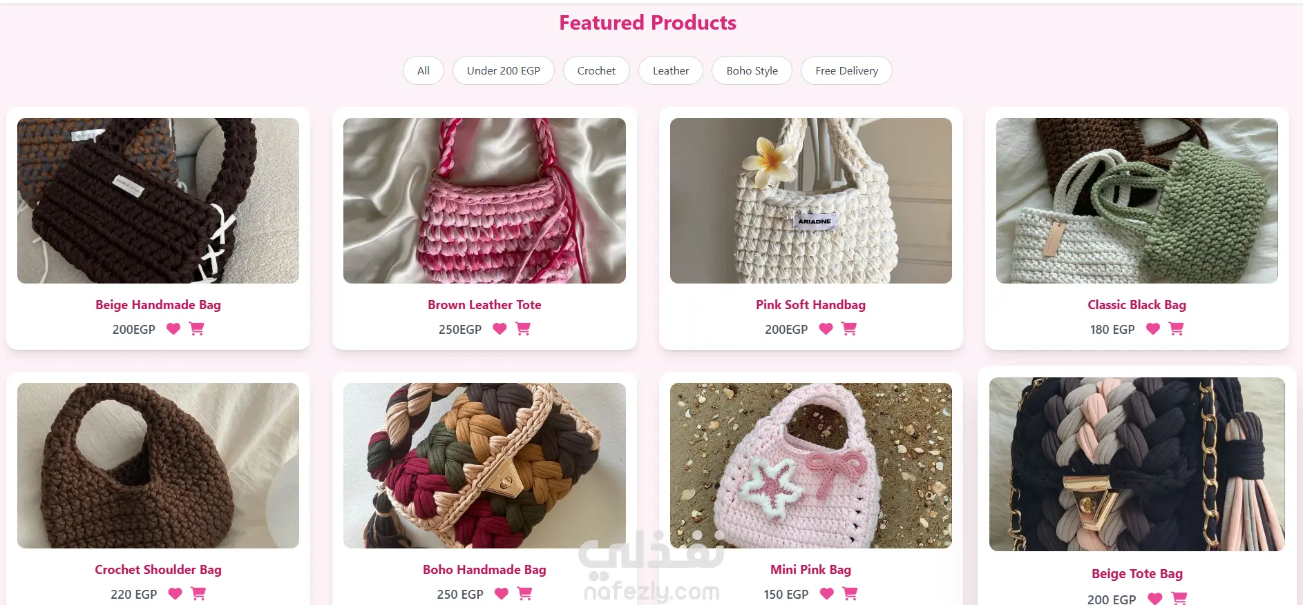 مشروع متجر إلكتروني لشنط وإكسسوارات هاند ميد تم تطويره باستخدام HTML, Tailwind CSS, وJavaScript.