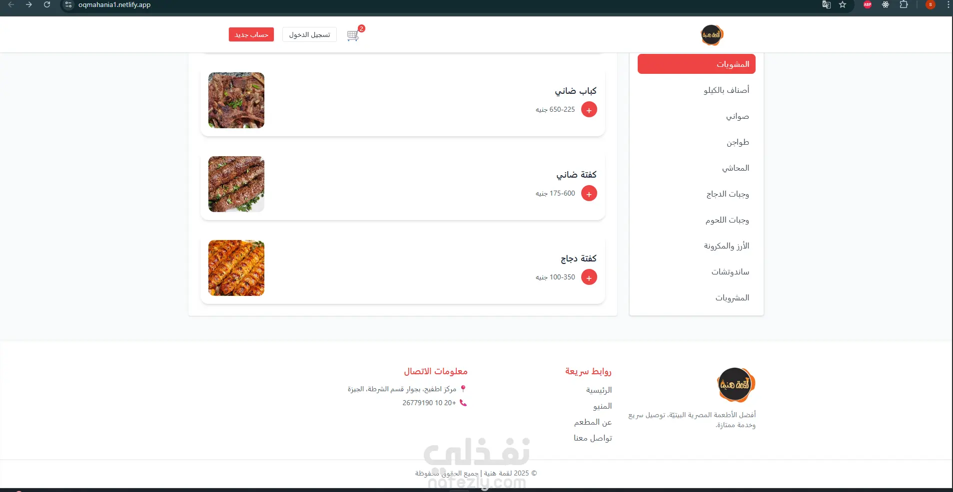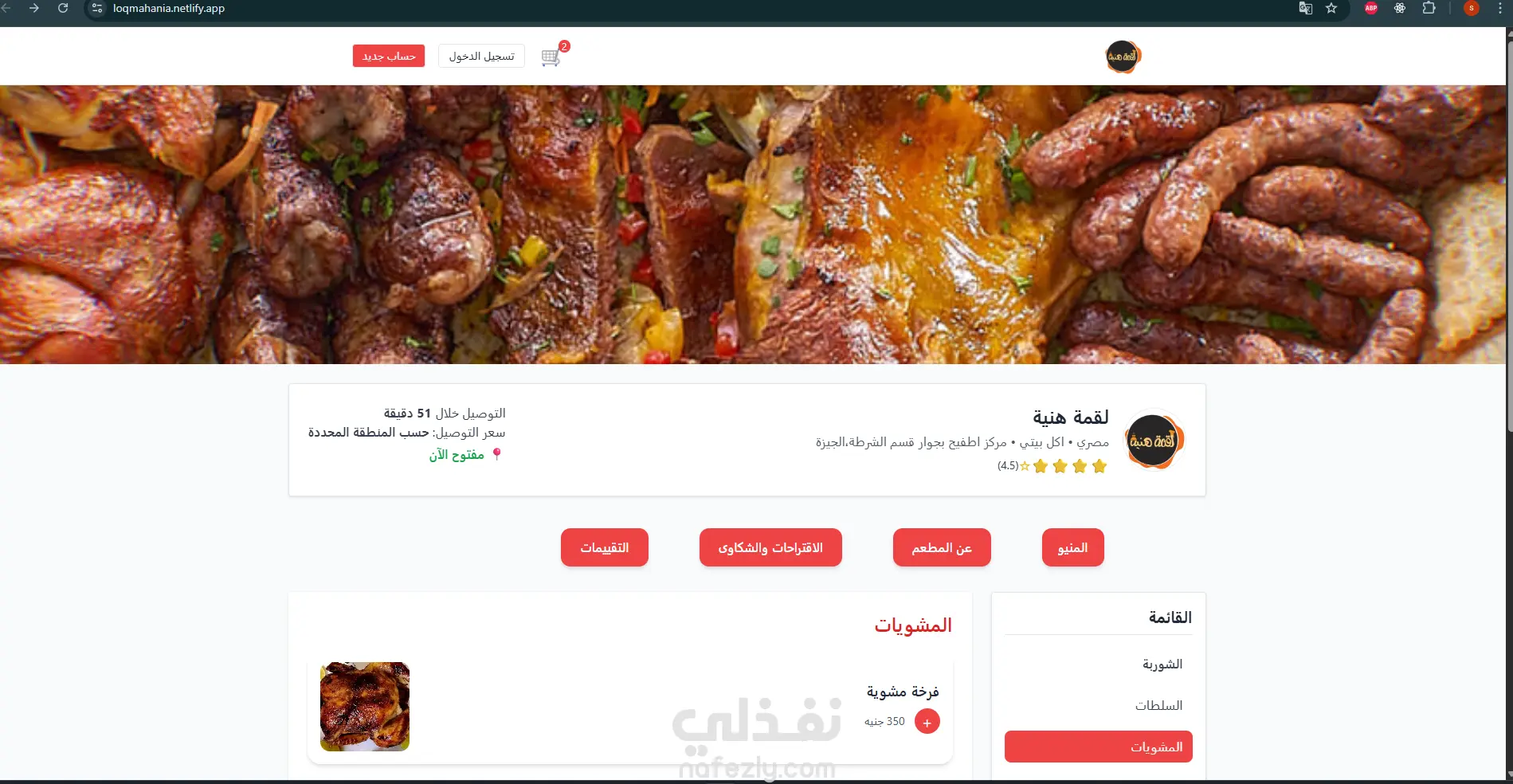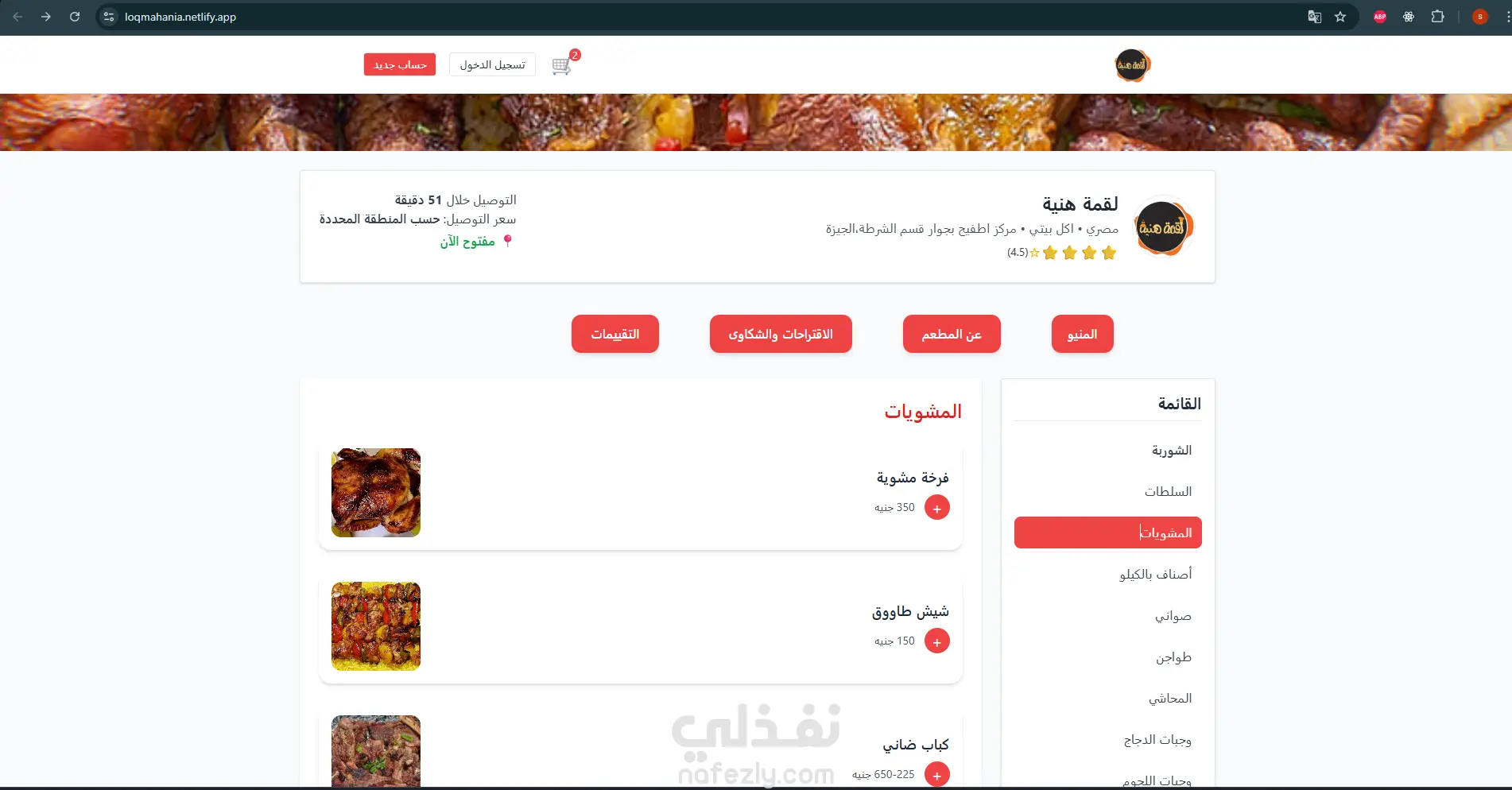 الموقع يعرض قائمة الطعام بشكل منظم وجذاب، مع إمكانية تصفح الأصناف بسهولة.
