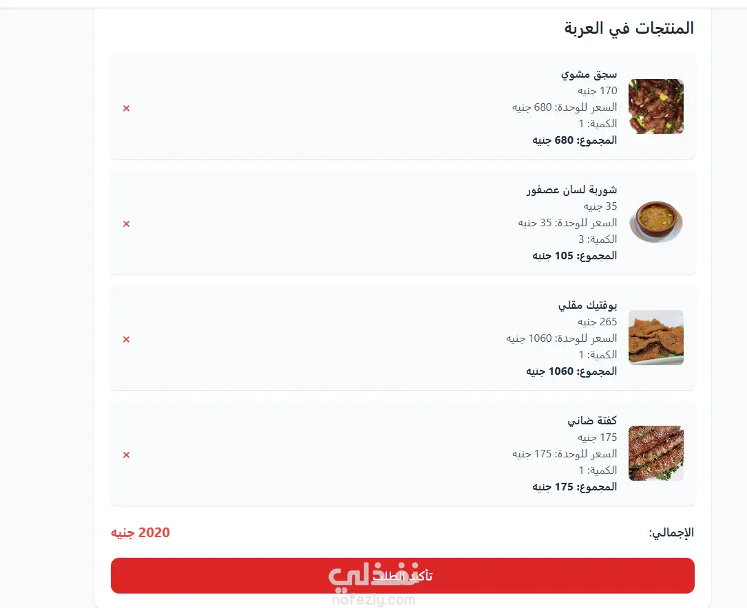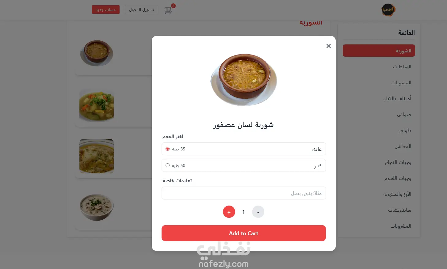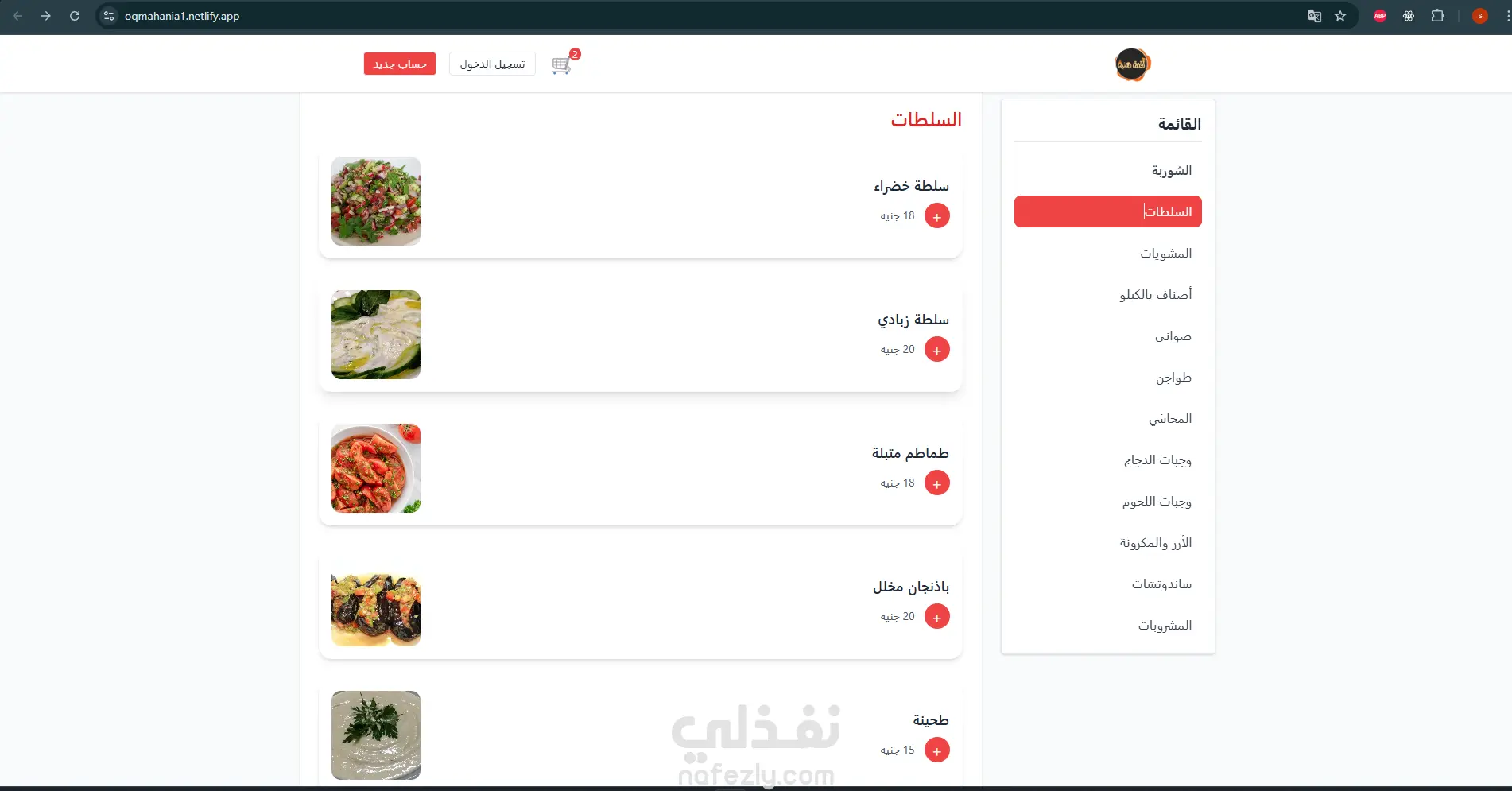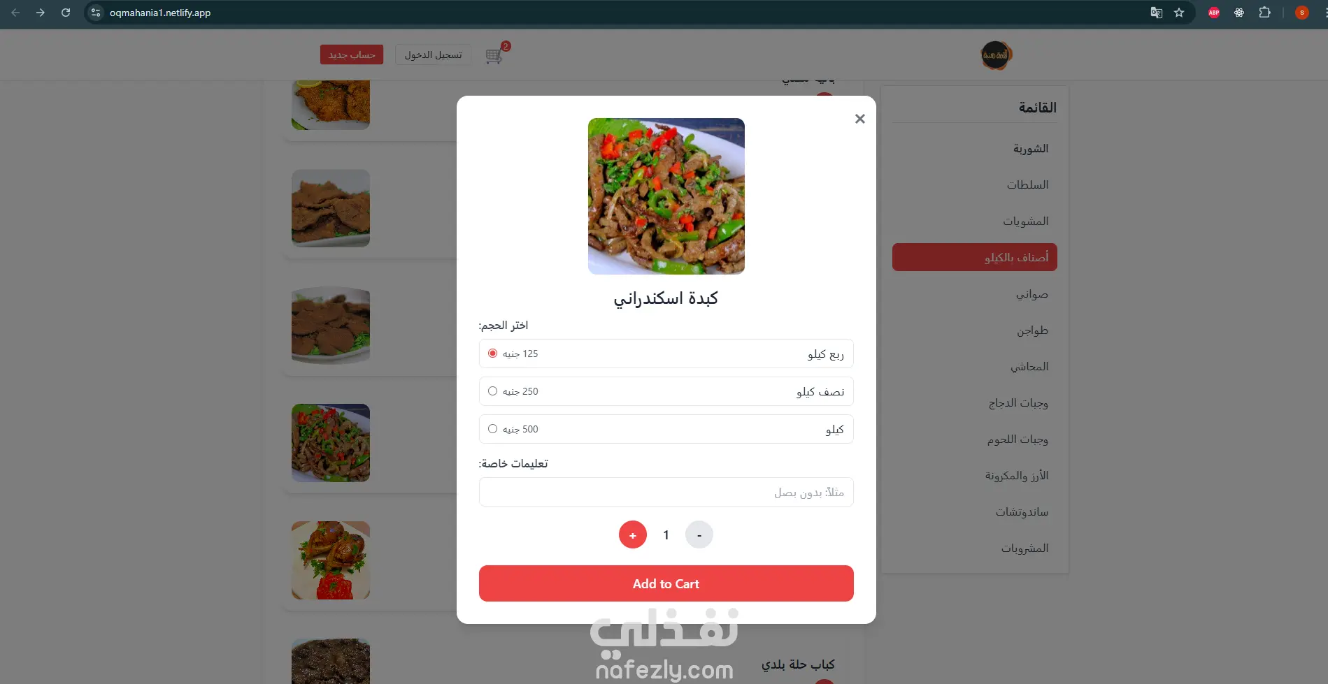 الموقع يعرض قائمة الطعام بشكل منظم وجذاب، مع إمكانية تصفح الأصناف بسهولة.