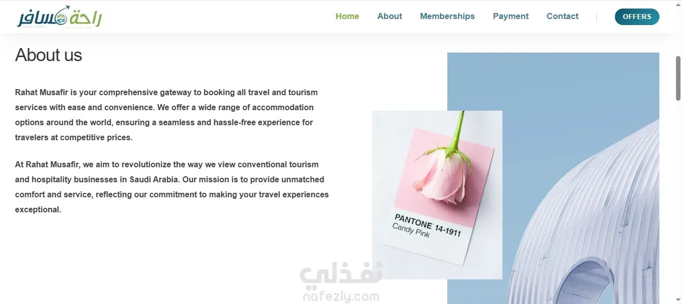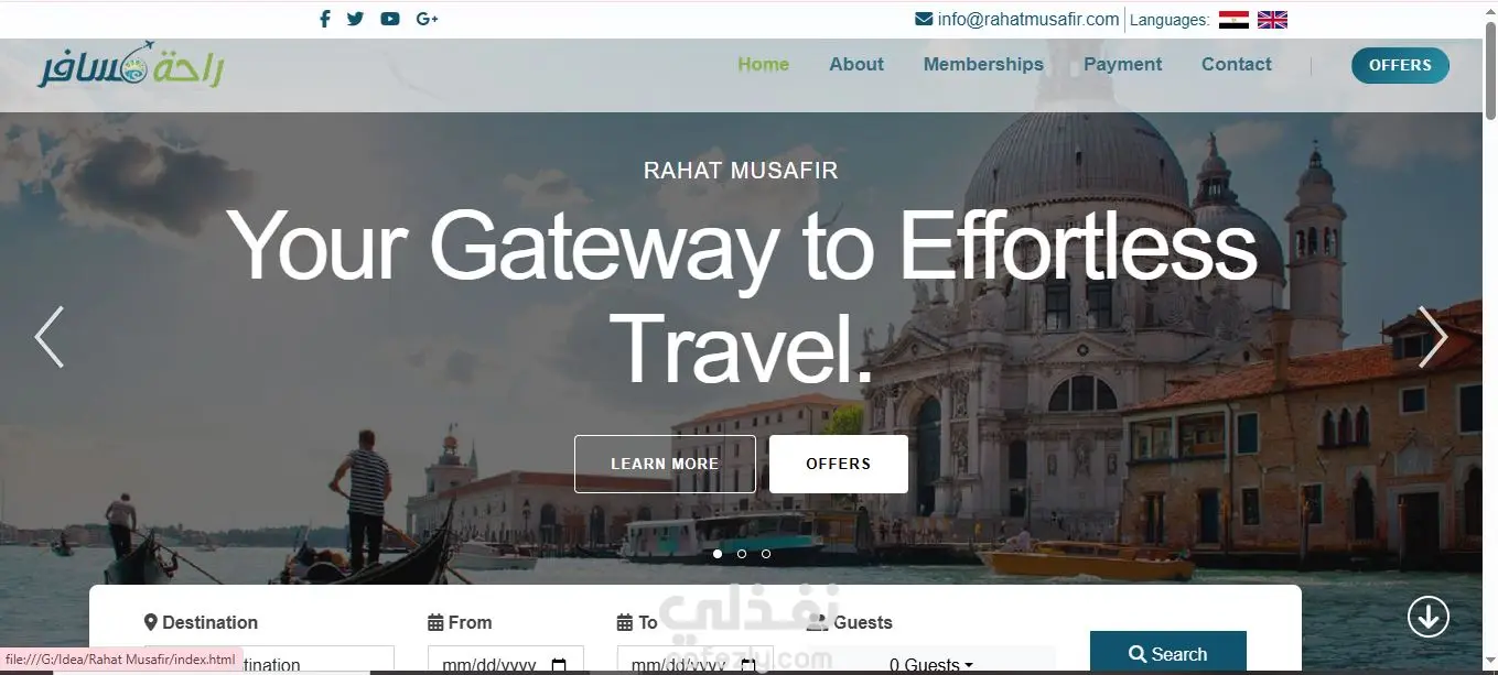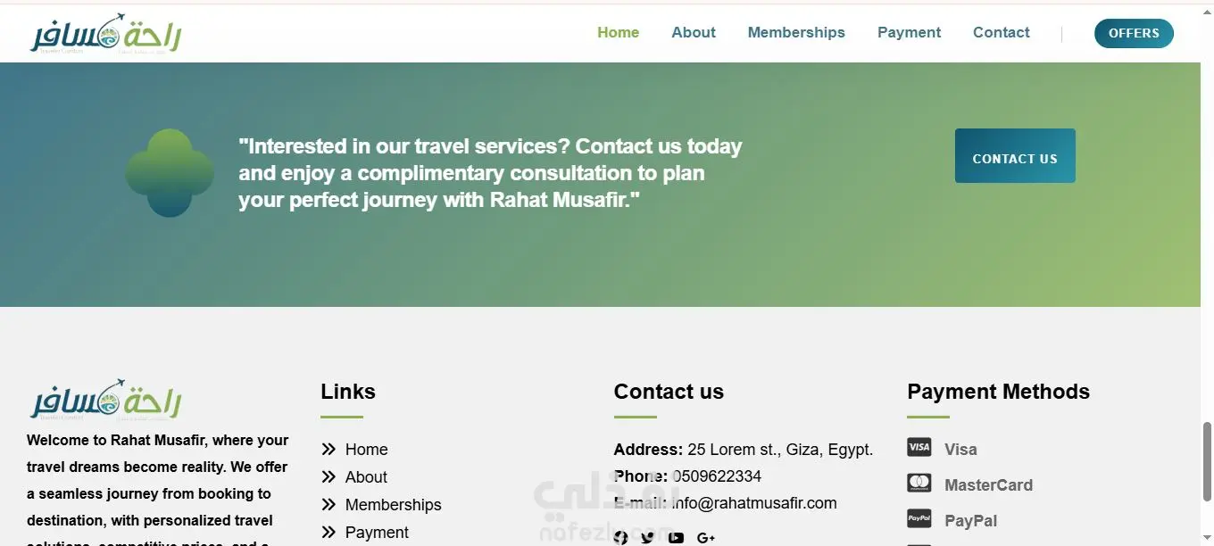 في Rahat Musafir، قمنا بتصميم وتطوير الموقع الإلكتروني للشركة باستخدام HTML, CSS, JavaScript، وBootstrap، مع التركيز على واجهة حديثة ونظيفة تعكس هوية الشركة واحترافية خدماتها. تم تصميم صفحات متجاوبة (Responsive) لتعمل بسلاسة على جميع الأجهزة، مع تفاعلات ديناميكية تشمل: سلايدرز للوجهات السياحية قوائم منسدلة للغات والعضويات نماذج تواصل فعّالة للاستفسارات وحجز الخدمات يهدف الموقع إلى تقديم تجربة مستخدم سلسة وجذابة، مع عرض خدمات السفر والحجز بطريقة مبتكرة، تجمع بين الجمال، الأداء، وسهولة الاستخدام. كما يعرض الموقع بوضوح خيارات العضويات، الحزم السياحية، وطرق الدفع المتاحة، مع التركيز على راحة العميل وتميز الخدمة في كل تفاصيل الرحلة.