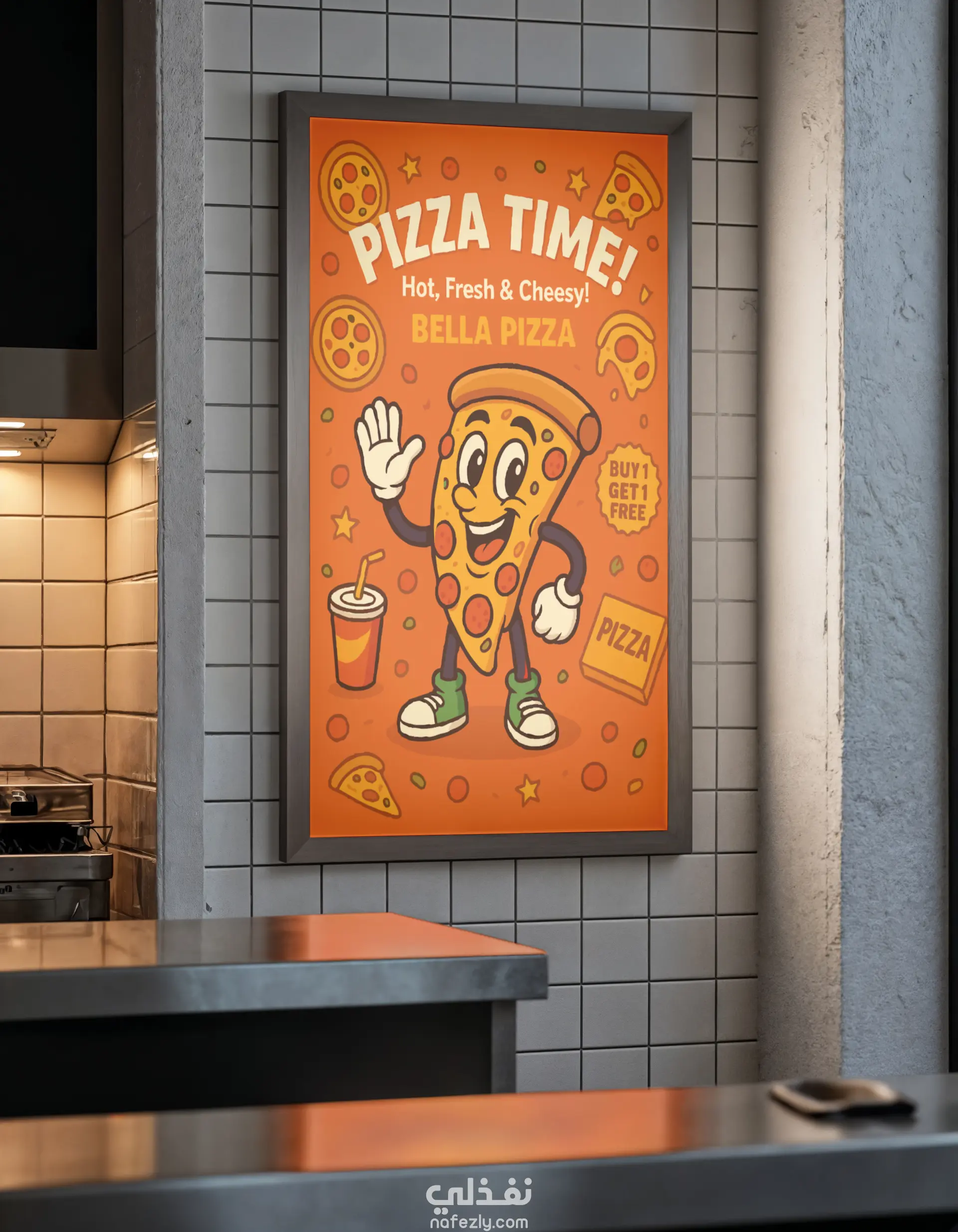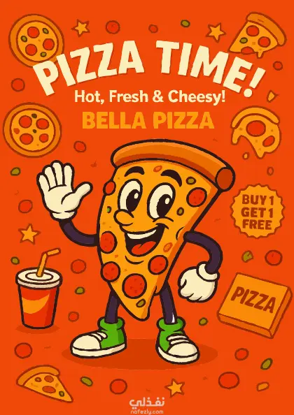 تصميم بوستر فيكتور مميز تم تنفيذه لمطعم Bella Pizza. يعتمد التصميم على شخصية بيتزا مرحة تُجسّد روح العلامة التجارية بطريقة ودّية وجذابة. تم استخدام لوحة ألوان دافئة يغلب عليها اللون البرتقالي لتعكس الطاقة والشهية، مع توظيف خطوط عريضة وواضحة لإبراز العروض الترويجية مثل "اشترِ واحدة واحصل على الثانية مجانًا".