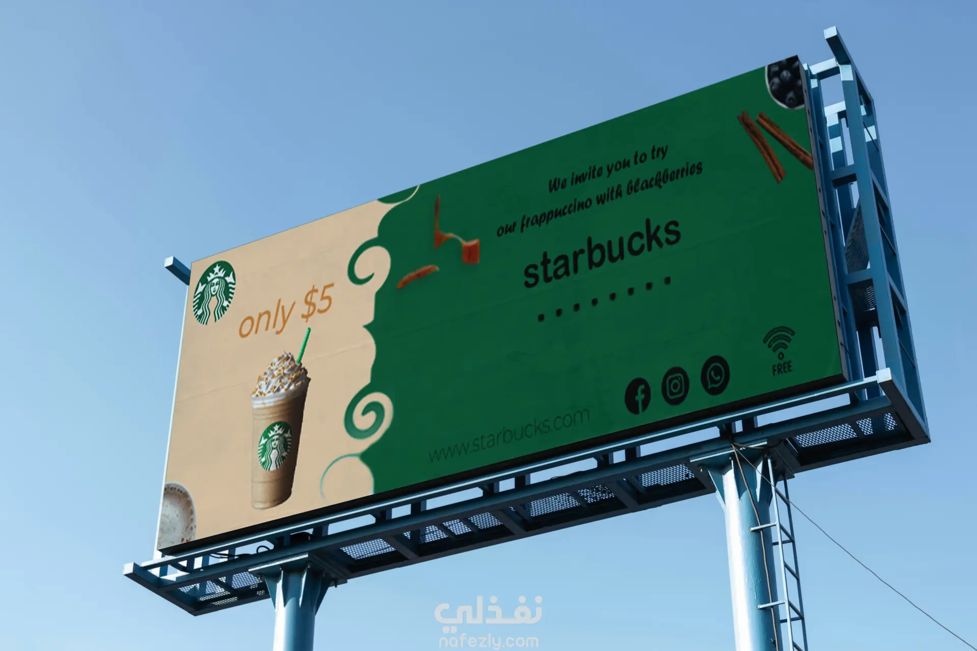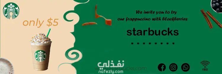 تصميم لافتة ويب لستاربكس. يستخدم التصميم لونين أخضر وبيج، مع شعار ستاربكس في أعلى اليسار، مما يضفي عليه طابعًا أنيقًا يشبه القهوة. على الجانب الأيسر، توجد صورة فرابتشينو مع عبارة "5 دولارات فقط" لإبراز السعر بوضوح. على الجانب الأيمن، تحمل اللافتة رسالة: "ندعوك لتجربة فرابتشينو بالتوت الأسود" مكتوبة بخط بسيط، مع كتابة "ستاربكس" بخط عريض لتسليط الضوء على العلامة التجارية. يتضمن التصميم أيضًا عناصر مرئية لمكونات القهوة (مثل أعواد القرفة وقطع الكراميل) للزينة، بالإضافة إلى أيقونات لوسائل التواصل الاجتماعي، والموقع الإلكتروني الرسمي في الأسفل للتواصل. بشكل عام، إنها لافتة ترويجية بسيطة وواضحة وجذابة تعرض المنتج والسعر والعلامة التجارية بشكل مباشر.