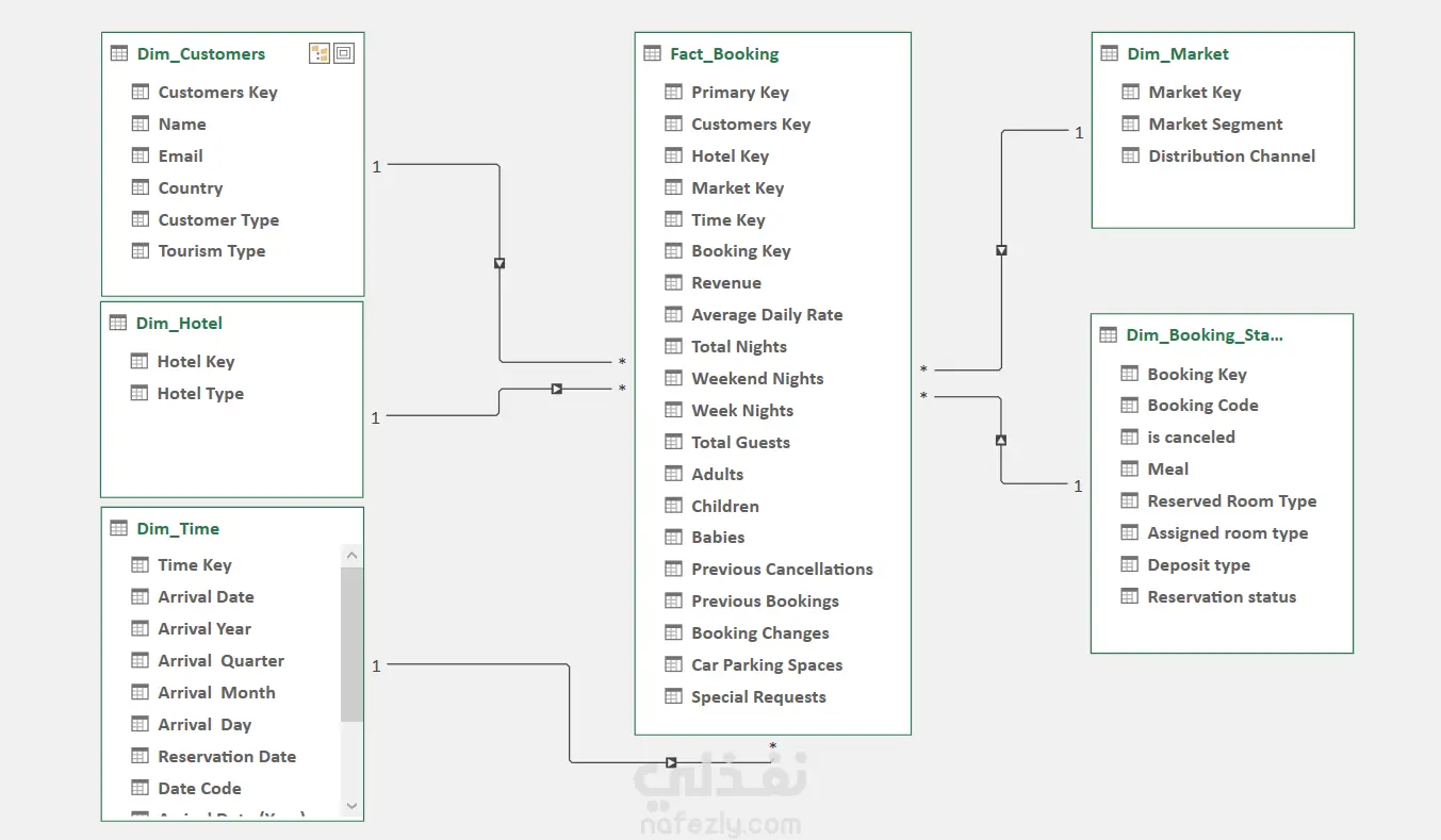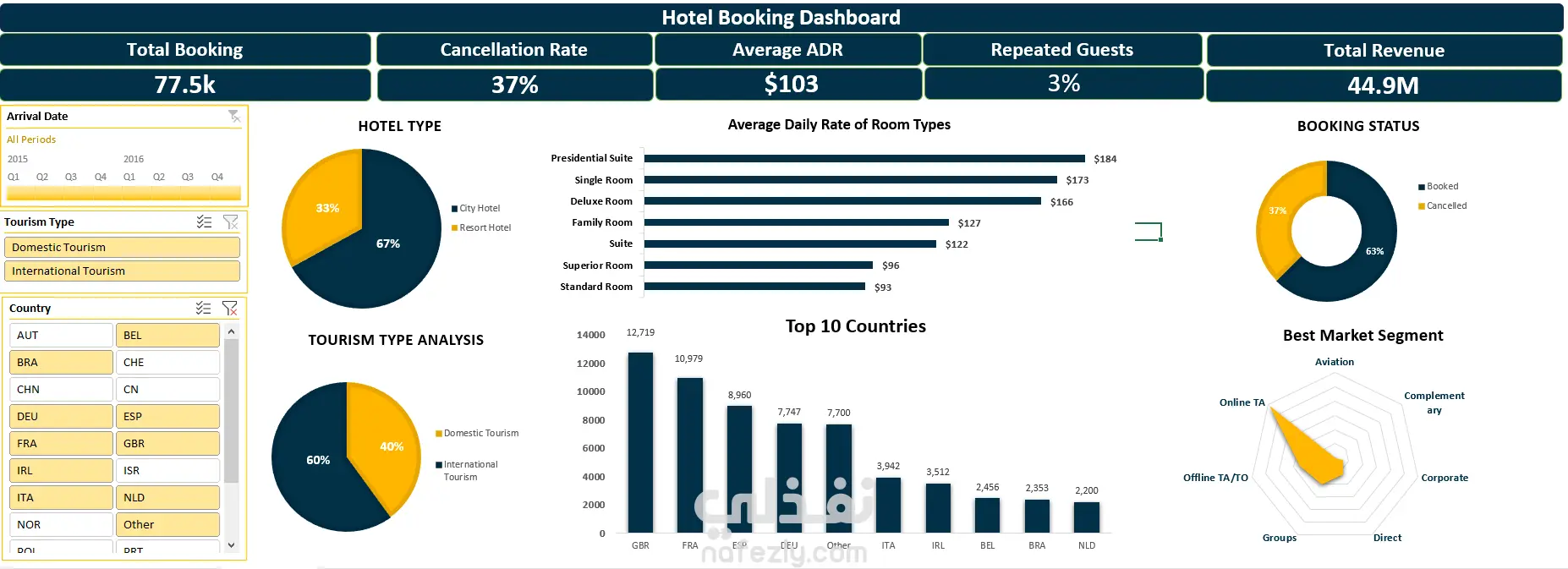 تم العمل على بيانات لفندق سياحي: 1- تصنيف البيانات وتنظيفها من خلال quary 2- عمل داتا مودلينج وربط البيانات 3- استخراج اهم KPIs مثل اجمالي المبيعات و معدل الحجز والالغاء ...الخ 4- عمل داش بورد احترافية ومنسقة