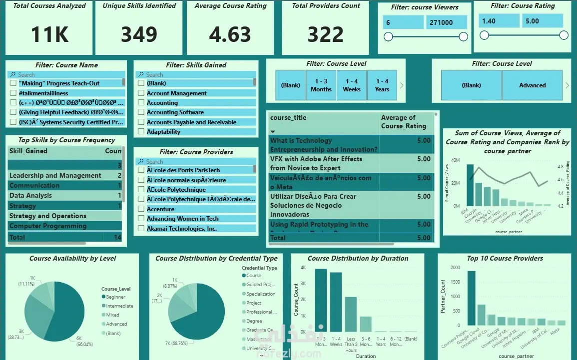 Comprehensive analytics dashboard analyzing 11K+ courses with 349 unique skills identified. Features advanced filtering capabilities, course distribution analysis, and provider performance metrics. Includes interactive visualizations for course ratings, skill frequency analysis, and provider comparisons.