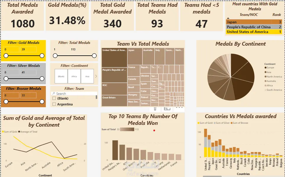 Interactive Olympic Games analytics dashboard tracking 1080 total medals across multiple Olympics. Features medal distribution analysis by continent, country performance metrics, and team comparison tools. Includes advanced filtering for gold, silver, and bronze medals with comprehensive geographical breakdowns.