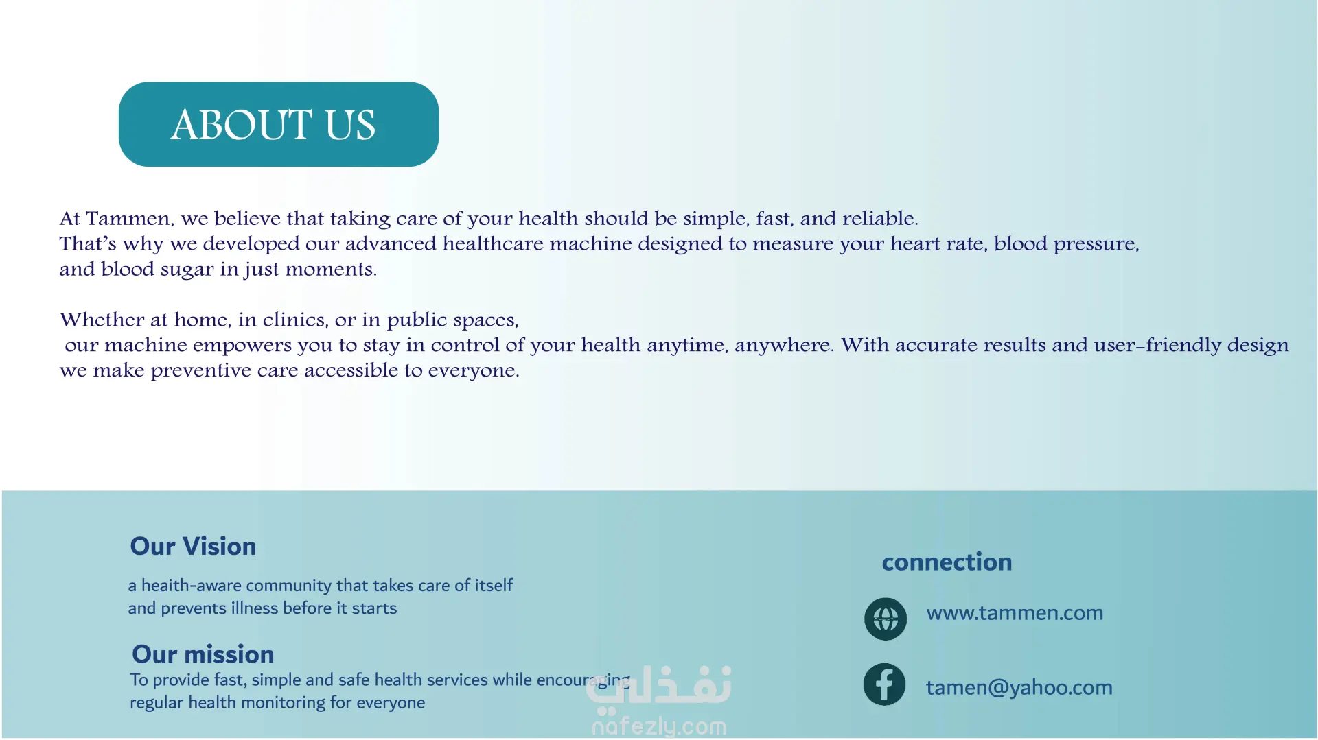 تصميم وتطوير موقع: قمت بتصميم موقع تعريفي متكامل لجهاز طَمّن، وهو جهاز طبي مبتكر يستخدم لقياس العلامات الحيوية ومتابعة الحالة الصحية للمستخدم بسهولة. يهدف الموقع إلى شرح الجهاز بشكل مبسط، وعرض طريقة عمله، والخدمات المقدمه، والفئات المستفيدة منه مميزات التصميم: 1-تصميم بسيط يركز على الوضوح والراحة البصرية 2-واجهة نظيفة ومرتبة بتصميم طبي حديث 3-ألوان هادئة مناسبة للمجال الطبي 4-متوافق مع جميع الأجهزة (موبايل – تابلت – كمبيوتر) 5-تنسيق واضح للمحتوى لتسهيل فهم الجهاز 6-تحسينات أساسية لمحركات البحث SEO