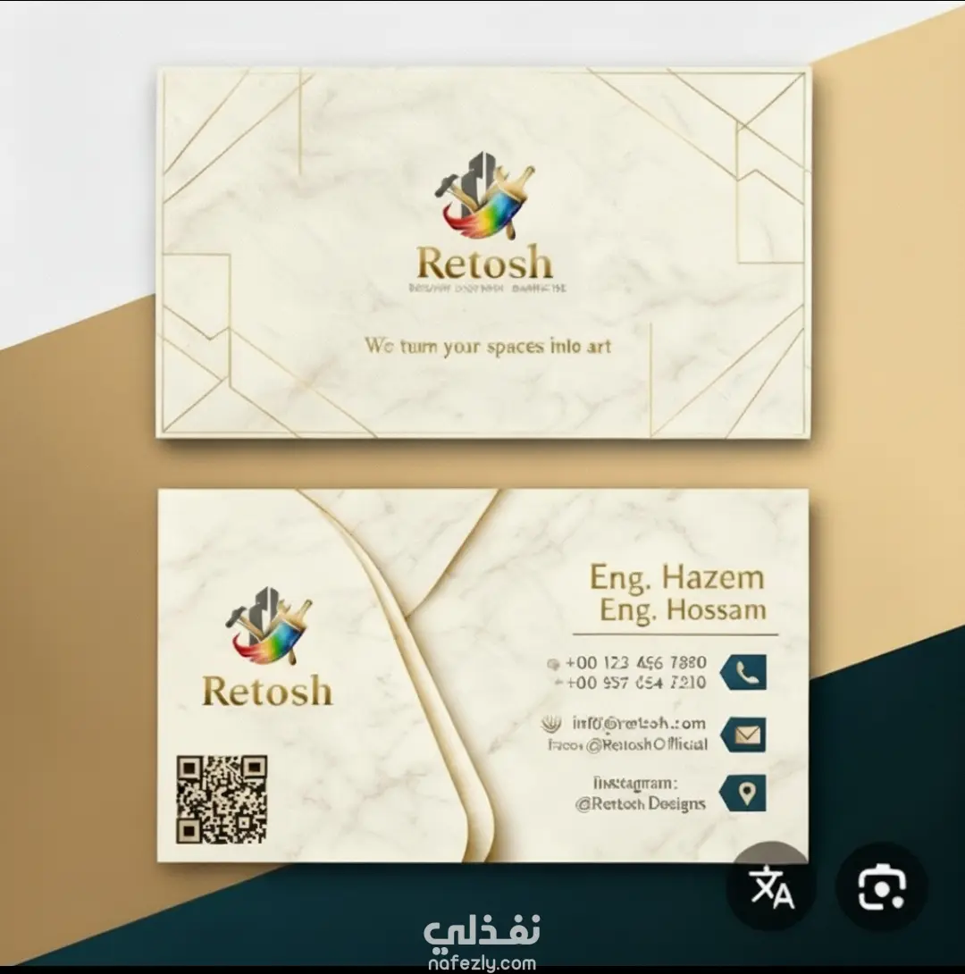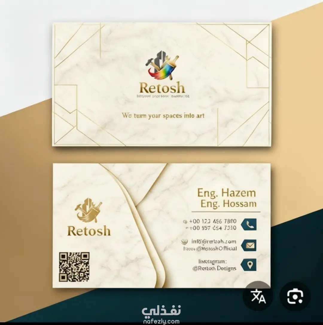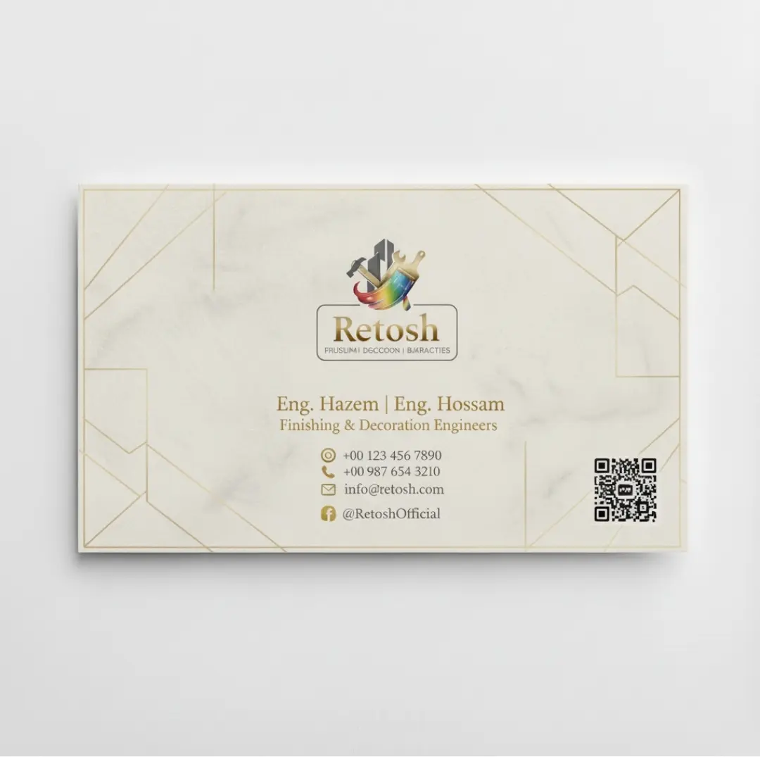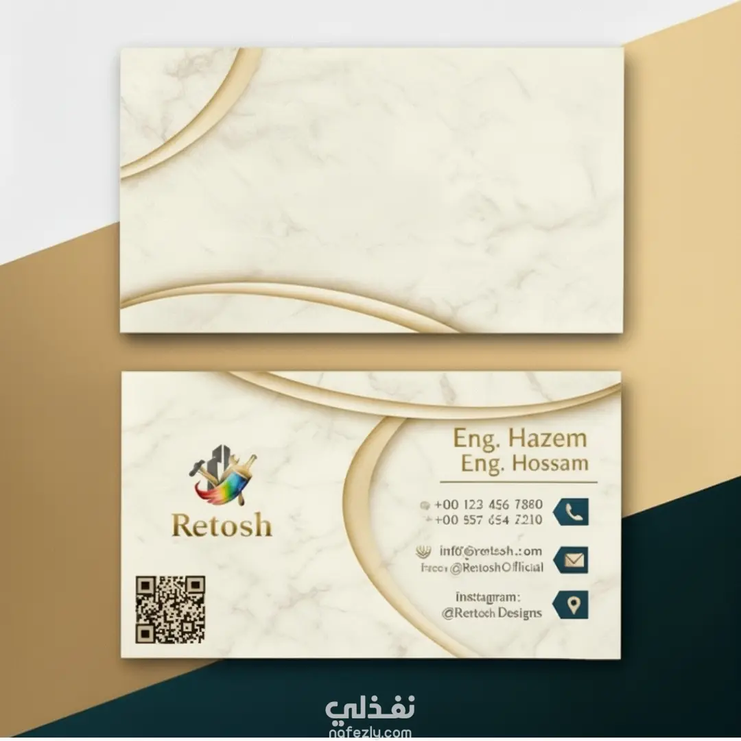 اللوجو من تصميمي بالكامل، مع استخدام توزيع مدروس للعناصر، أيقونات التواصل، ودمج QR code لضمان سهولة الاستخدام.