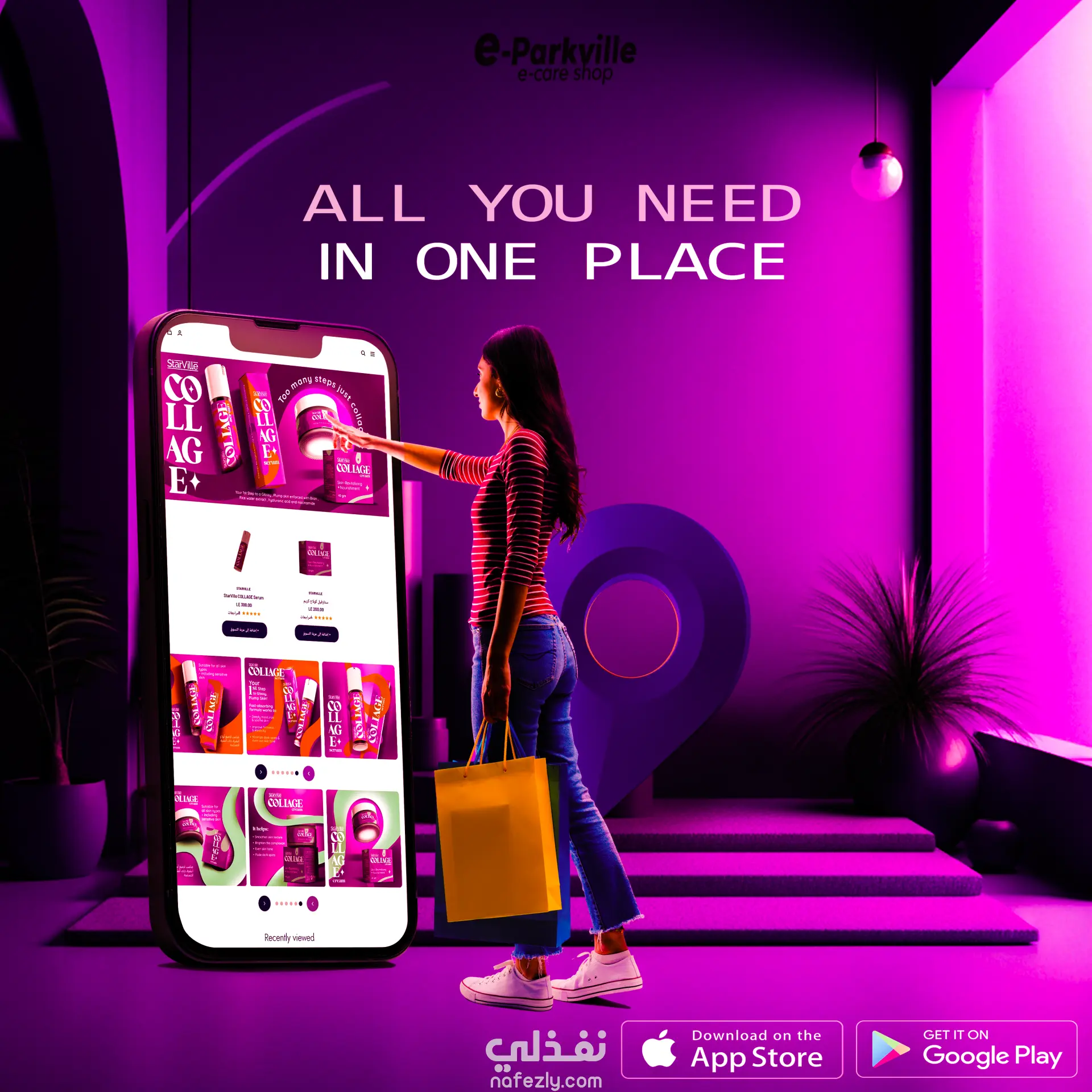 قمت بتصميم هذا البوستر للإعلان عن تطبيق تسوّق شامل يحتوي على منتجات متنوعة مثل التجميل والأزياء والمستلزمات المنزلية وغيرها.