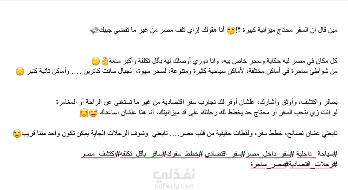 كتابة محتوى عن السفر بطريقة جذابة ومشوقة لرحالة مصري على صفحة الانستجرام الخاصة به مع استخدام الهاشتاجات المناسبة للمنصة ومراعاة الخوارزميات لتصدر محركات البحث والهدف منها زيادة عدد المتابعين للصفحة.