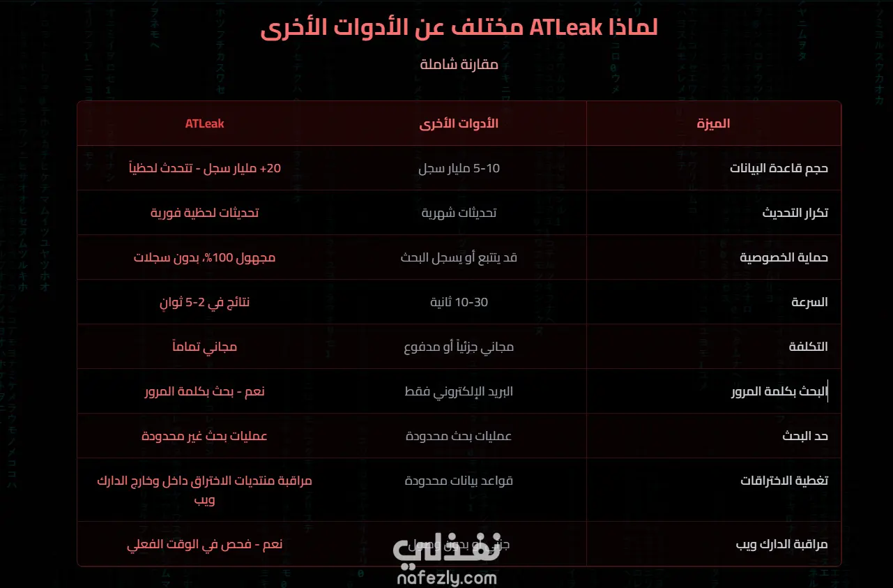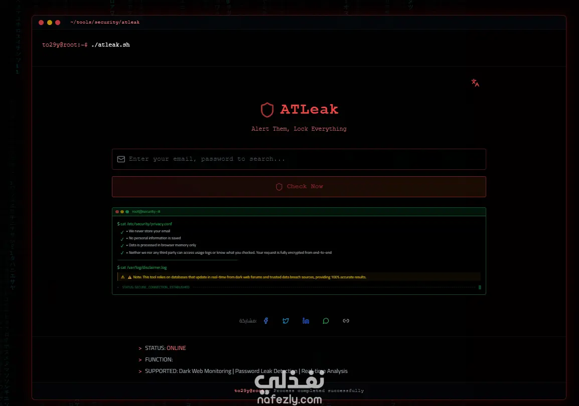 أداة متقدمة صممت خصيصًا لحماية المستخدمين من تسريب بياناتهم على الإنترنت، من خلال فحص مباشر لقواعد بيانات ضخمة في الدارك ويب (Dark Web) ومنتديات الـ Hacking الشهيرة بتسريب وبيع البيانات. تم بناء الأداة بمعايير عالية من الأمان والخصوصية، وبدون أي عمليات تسجيل أو تخزين لإيميل المستخدم — على عكس أغلب الأدوات المتاحة حاليًا. هذه الأداة ليست مجرد فحص تقليدي؛ بل منصة متكاملة تعمل أيضًا على فحص كلمات المرور المسربة إلى جانب البريد الإلكتروني، مما يمنح المستخدم مستوى حماية شامل ومبكر من أي اختراق محتمل. القدرات الأساسية فحص فوري لقاعدة بيانات ضخمة من التسريبات والاختراقات. عرض تفاصيل دقيقة لكل اختراق تم العثور عليه. توضيح تاريخ ومصدر التسريب والموقع أو الخدمة التي حدثت فيها المشكلة. تحديد نوع البيانات التي تم تسريبها (باسورد — رقم — IP — موقع — جهاز…). ️ فحص كلمات المرور المسربة وليس الإيميل فقط. توصيات أمنية احترافية لتحسين مستوى الحماية فورًا. استعلامات خصوصية بالكامل بدون تتبع أو تسجيل. ميزات الأمان عدم تخزين البريد الإلكتروني أو أي بيانات للمستخدم على أي خادم. اتصالات مشفرة بالكامل End-to-End. فحص مجهول 100% بدون تسجيل دخول. متوافق مع GDPR وسياسات حماية الخصوصية العالمية. لماذا هذه الأداة مهمة؟ مع انتشار عمليات الاختراق وتسريب البيانات بشكل غير مسبوق، أصبح من الضروري امتلاك وسيلة موثوقة للتحقق من أمن بريدك الإلكتروني وكلمة المرور. هذه الأداة توفر للمستخدم إمكانية معرفة ما إذا كانت بياناته معروضة في أي تسريب أو قاعدة بيانات مخترقة، وتساعده على اتخاذ خطوات وقائية فورية لحماية هويته الرقمية. ملاحظة هذه الأداة واحدة فقط من مجموعة أدوات أمنية أخرى قمت بتطويرها.