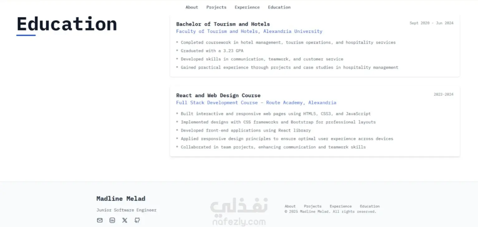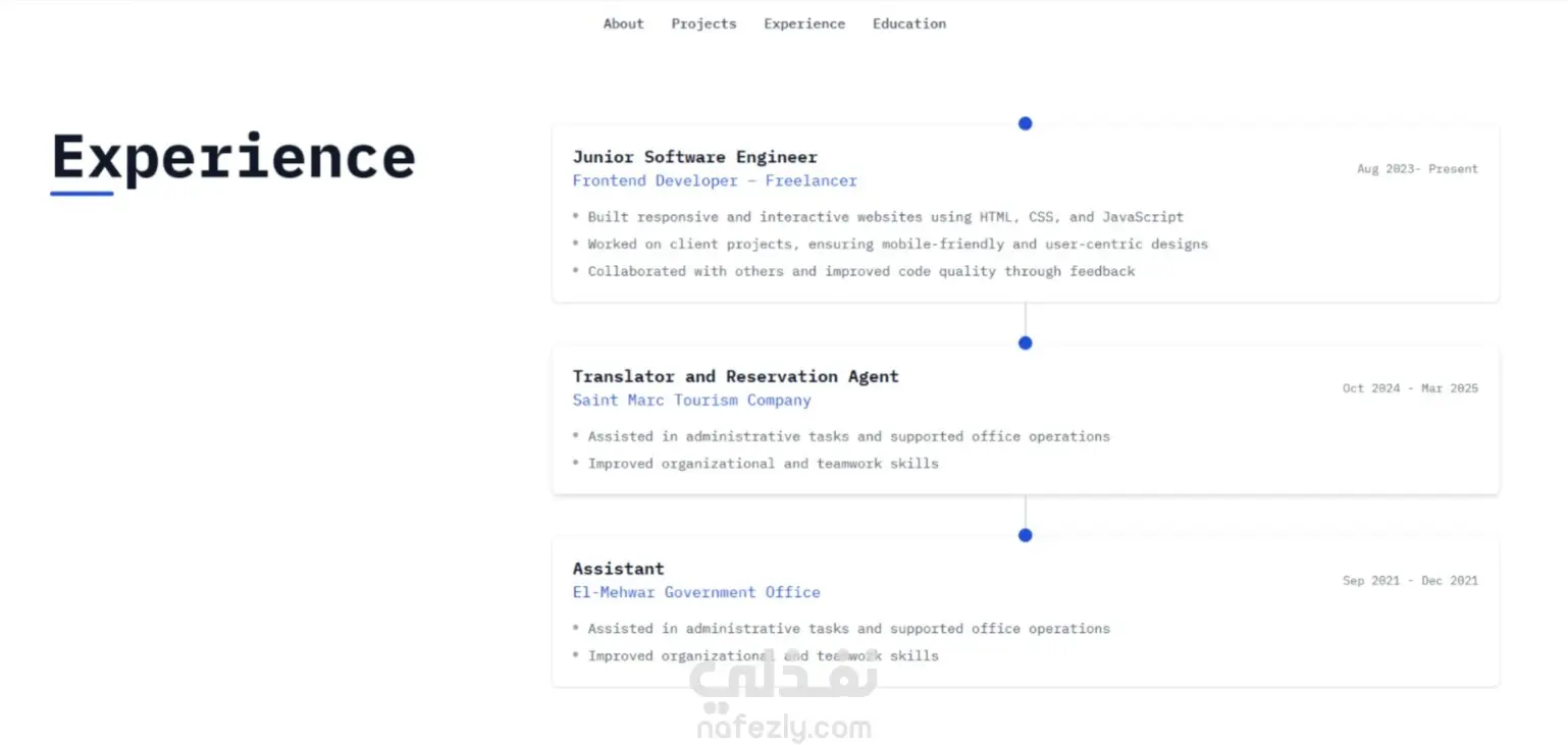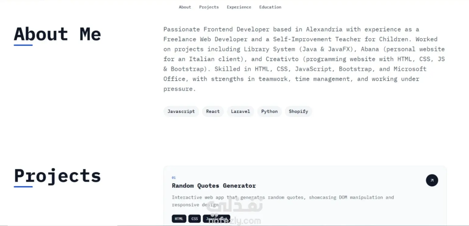 موقع Portfolio للتقديم علي الوظائف و يعرض فيه خبراتك و اعمالك و مهارات موقع متوافق مع جميع الاجهزة و به قسم للخدمات و قسم للمهارات و قسم للاحداث و العروض و تم الاستخدما به HTML و CSS و JS