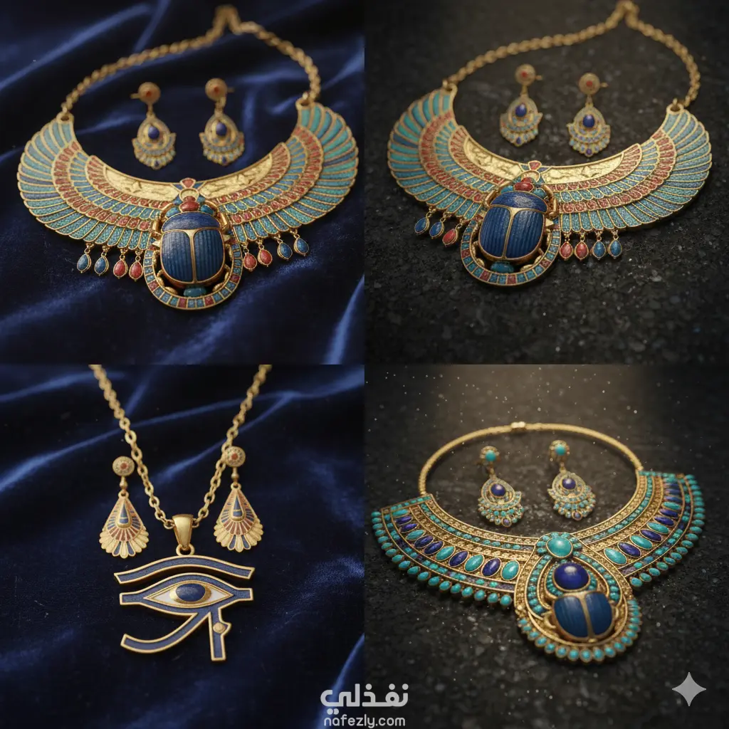 قمت بعمل فيديو دعائي لمنتجات حلي فرعونية خيالية باستخدام صور قمت بانشائها باستخدام ال ai واستخدام موسيقي وصوت توضيحي