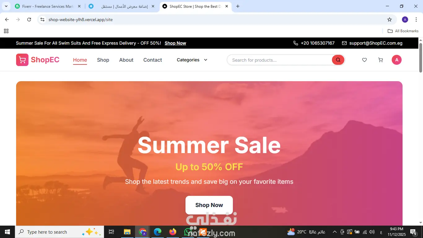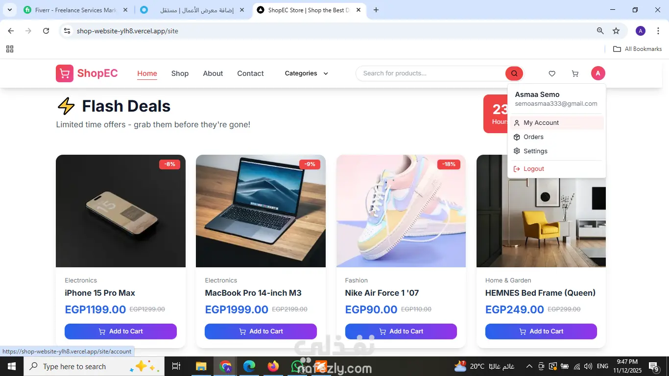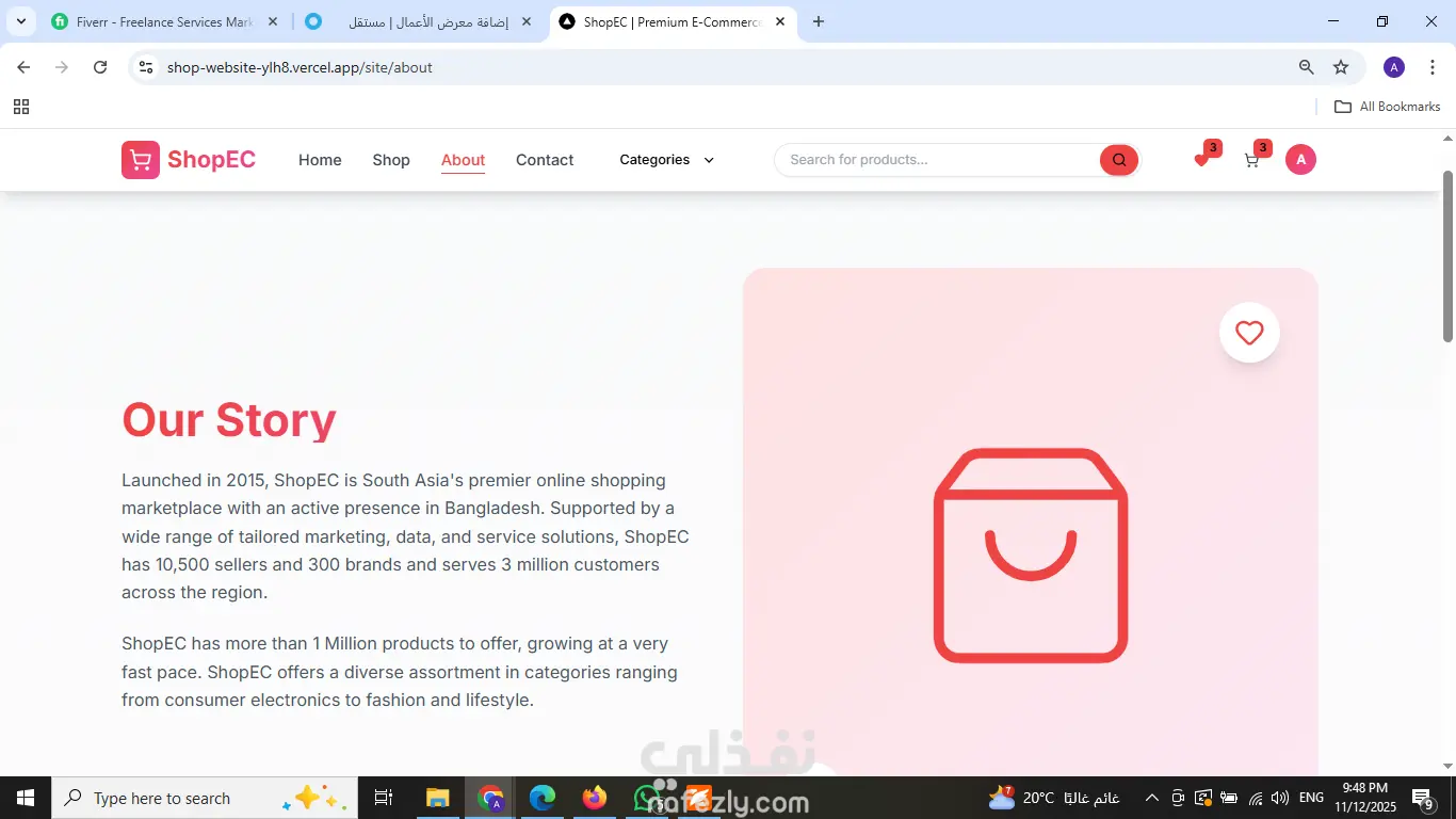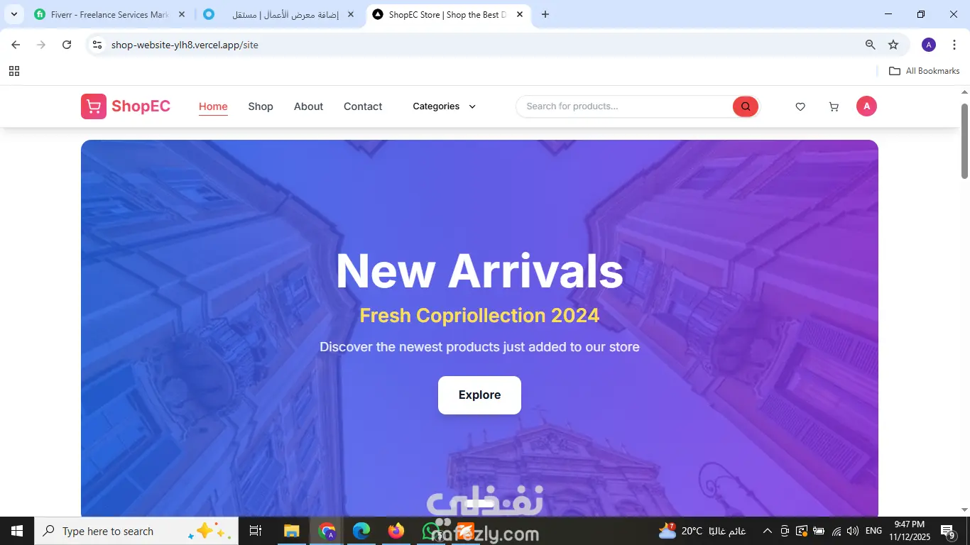 مت بتصميم وتطوير منصة تجارة إلكترونية (E-commerce) متكاملة تهدف إلى توفير تجربة تسوق سلسة وسريعة للمستخدمين. مميزات المشروع: [cite_start]* أداء عالي وسرعة فائقة: تم بناء الموقع باستخدام Next.js لضمان سرعة تحميل الصفحات وتحسين الأرشفة (SEO). [cite_start]* تصميم متجاوب (Responsive): الموقع يعمل بكفاءة على جميع الأجهزة (موبايل، تابلت، ديسكتوب) بفضل استخدام Tailwind CSS. [cite_start]* لوحة تحكم (Dashboard): يتضمن لوحة تحكم للإدارة مع تحليلات ومصادقة (Authentication). [cite_start]* ربط API: تكامل كامل مع RESTful APIs لعرض المنتجات وإدارة الطلبات. التقنيات المستخدمة: Next.js, React, TypeScript, Tailwind CSS.