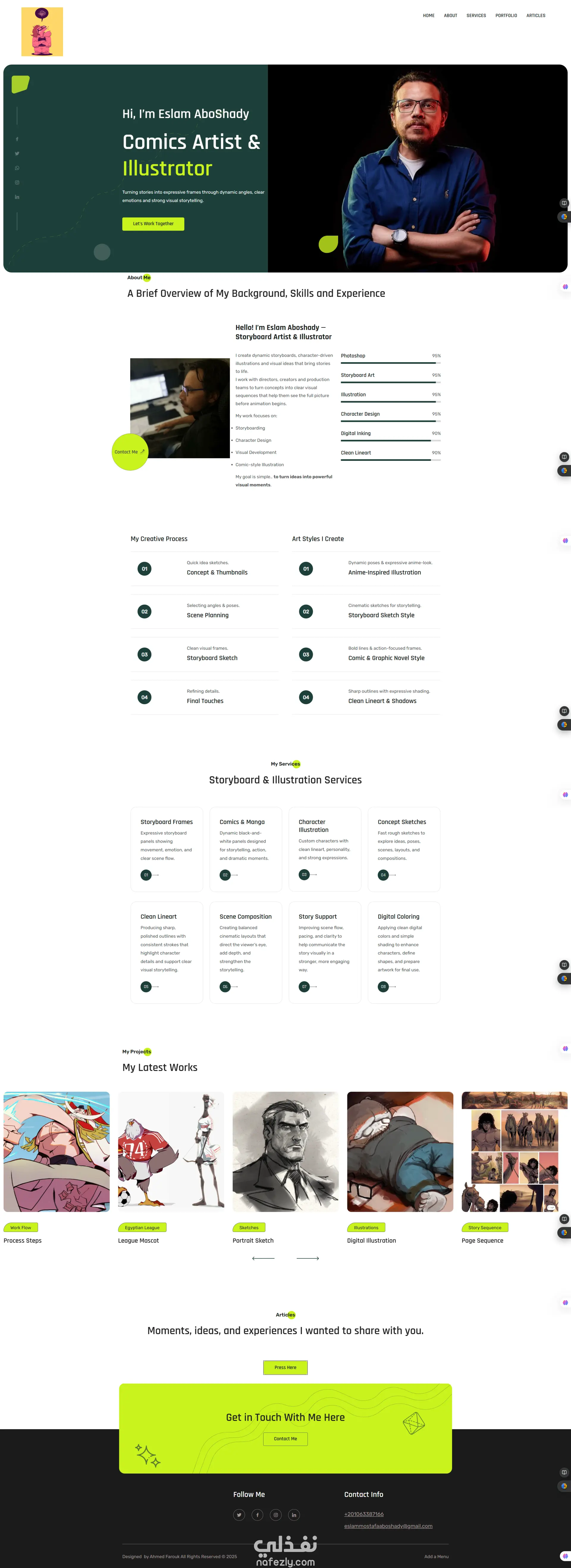 موقع إسلام أبو شادي هو بورتفوليو احترافي لرسام ستوري بورد و كوميكس و مانجا و كولوريست.. الموقع بيعرض أعماله في مجالات القصص المصورة و الستوري بورد و تصميم الشخصيات و الخلفيات بشكل منظم و سهل التصفح.. الهدف من الموقع هو تقديم معرض أعمال واضح و جذاب للعملاء و شركات الإنتاج و الاستوديوهات عشان يقدروا يشوفوا أسلوبه في الرسم و السرد البصري و يتواصلوا معاه بسهولة لتنفيذ المشاريع الإبداعية.
