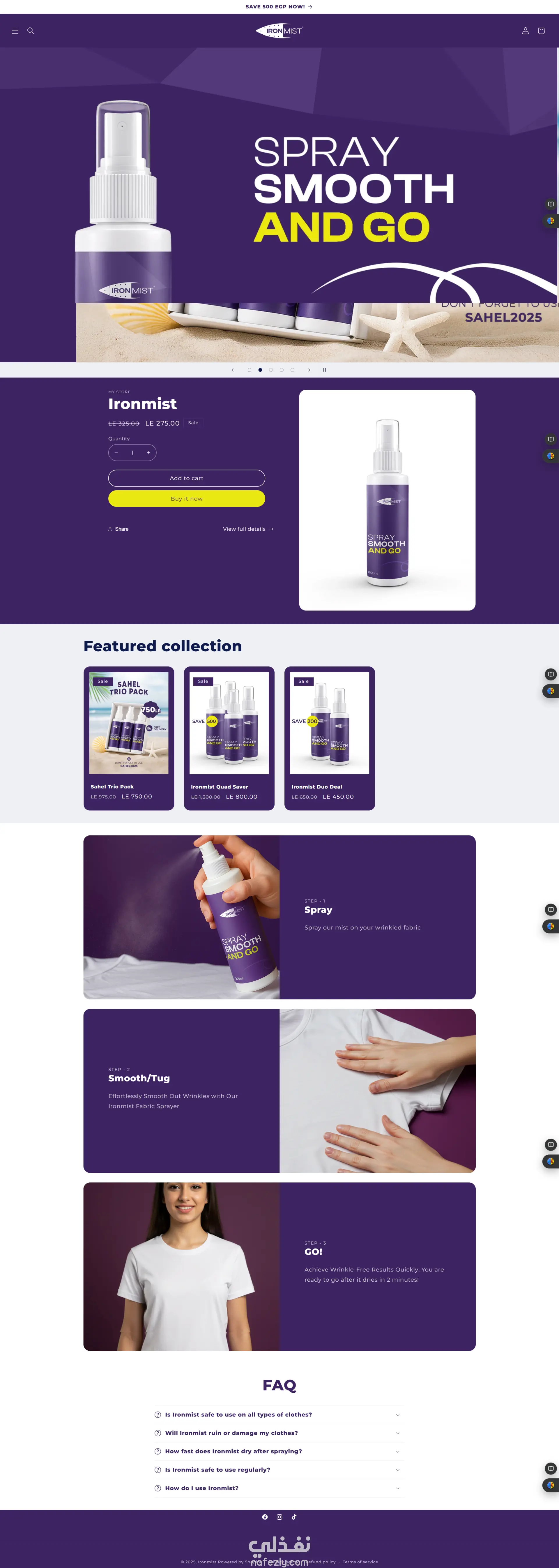 Iron Mist هو موقع إلكتروني مخصّص لبيع منتج Iron Mist Fabric Spray وهو سبراي مبتكر يستخدم لتنعيم الملابس وإزالة التجاعيد بسرعة بدون الحاجة إلى المكواة. يعرض الموقع المنتج بطريقة بسيطة وواضحة ويقدّم عروض شراء متعددة مثل Duo Deal و Quad Saver لتوفير أفضل قيمة للعميل. يحتوي الموقع على صفحة لشرح طريقة الاستخدام وصفحة للأسئلة الشائعة وسياسة الخصوصية والاسترجاع، بالإضافة إلى نظام طلب ودفع سهل يناسب المستخدم داخل مصر.