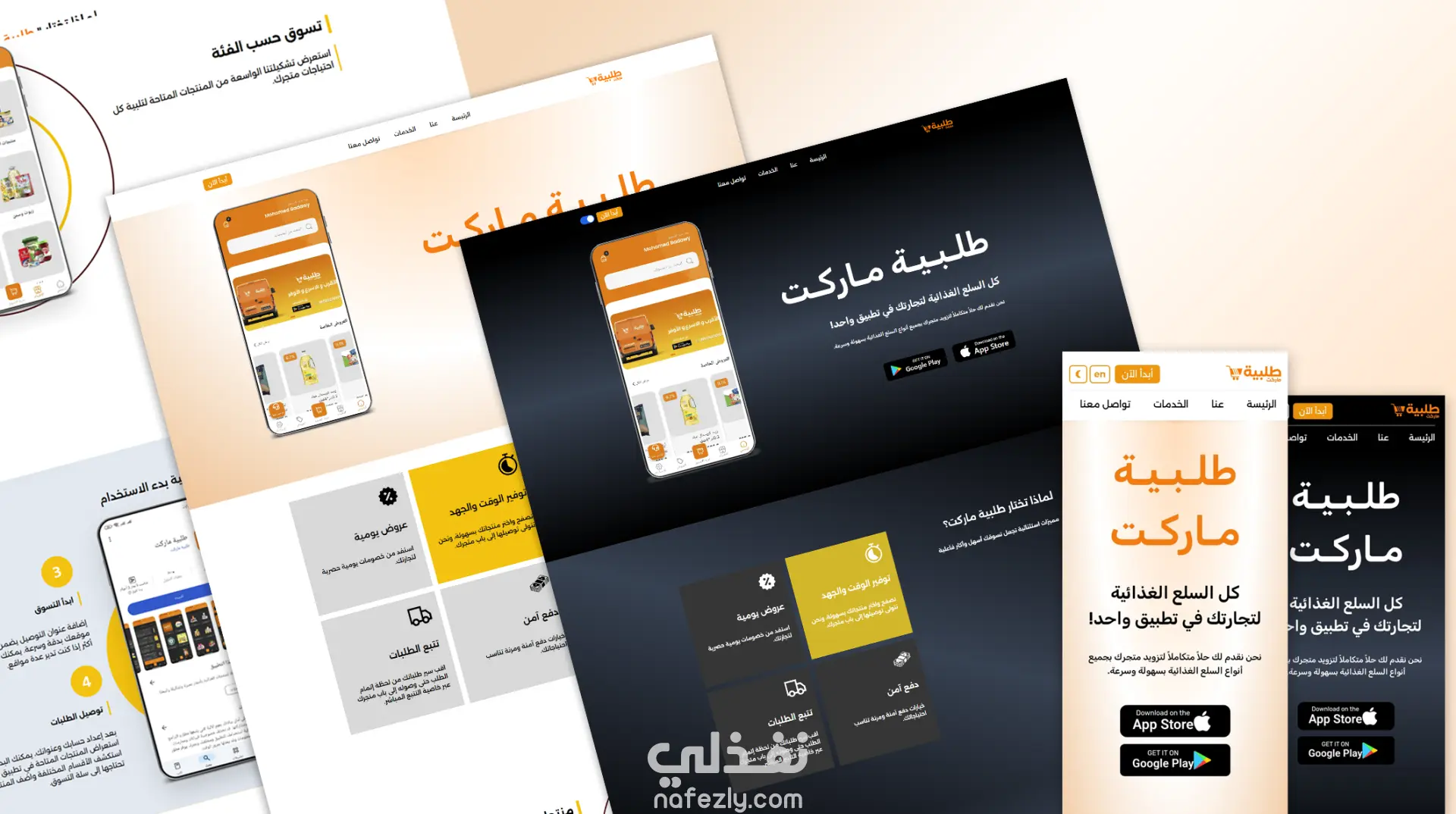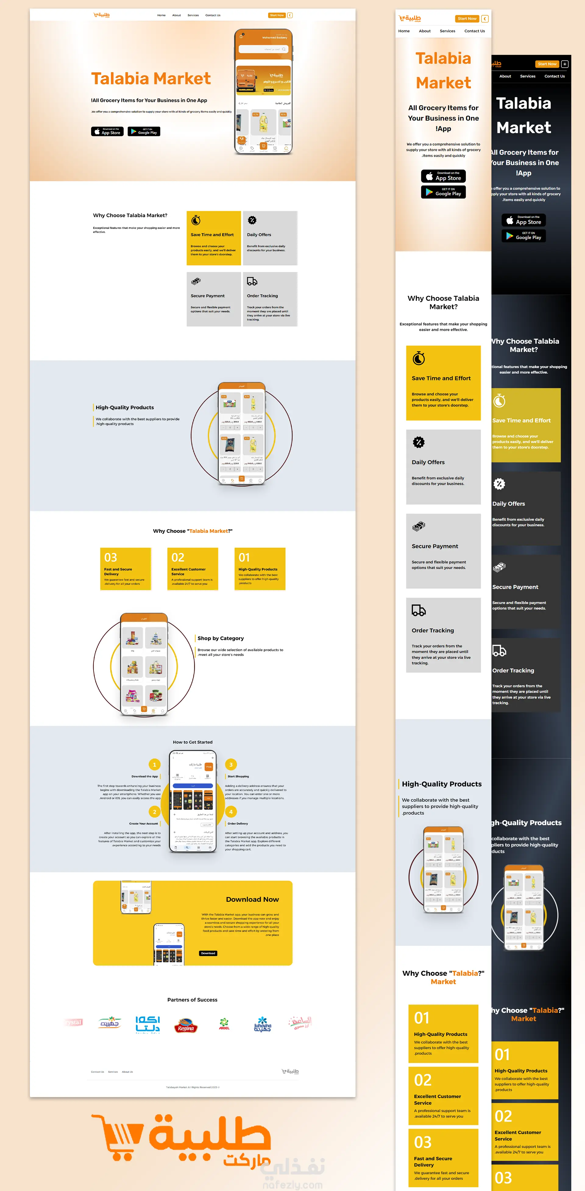 هدف المشروع: إحنا بنطور صفحة هبوط (Landing Page) لتطبيق "طلبية ماركت"، واللي هو عبارة عن منصة بتبيع المنتجات الغذائية بالجملة. الهدف الرئيسي من الصفحة دي إنها تشجع الناس إنهم يحملوا التطبيق وتديهم تجربة مريحة وجذابة.