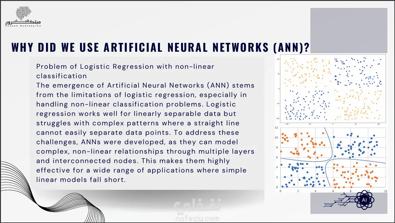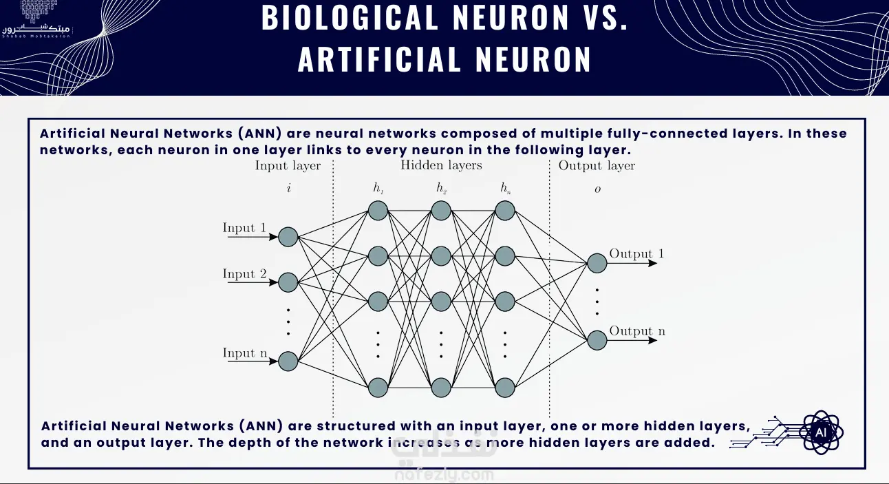 الـ Artificial Neural Network (ANN) هي نموذج مستوحى من طريقة عمل المخّ البشري، ويتكون من مجموعة من الوحدات الصغيرة تسمى Neurons ترتبط ببعضها من خلال Weights. تُستخدم الشبكات العصبية للتعلّم من البيانات وإيجاد علاقات معقدة لا تستطيع النماذج التقليدية اكتشافها بسهولة.