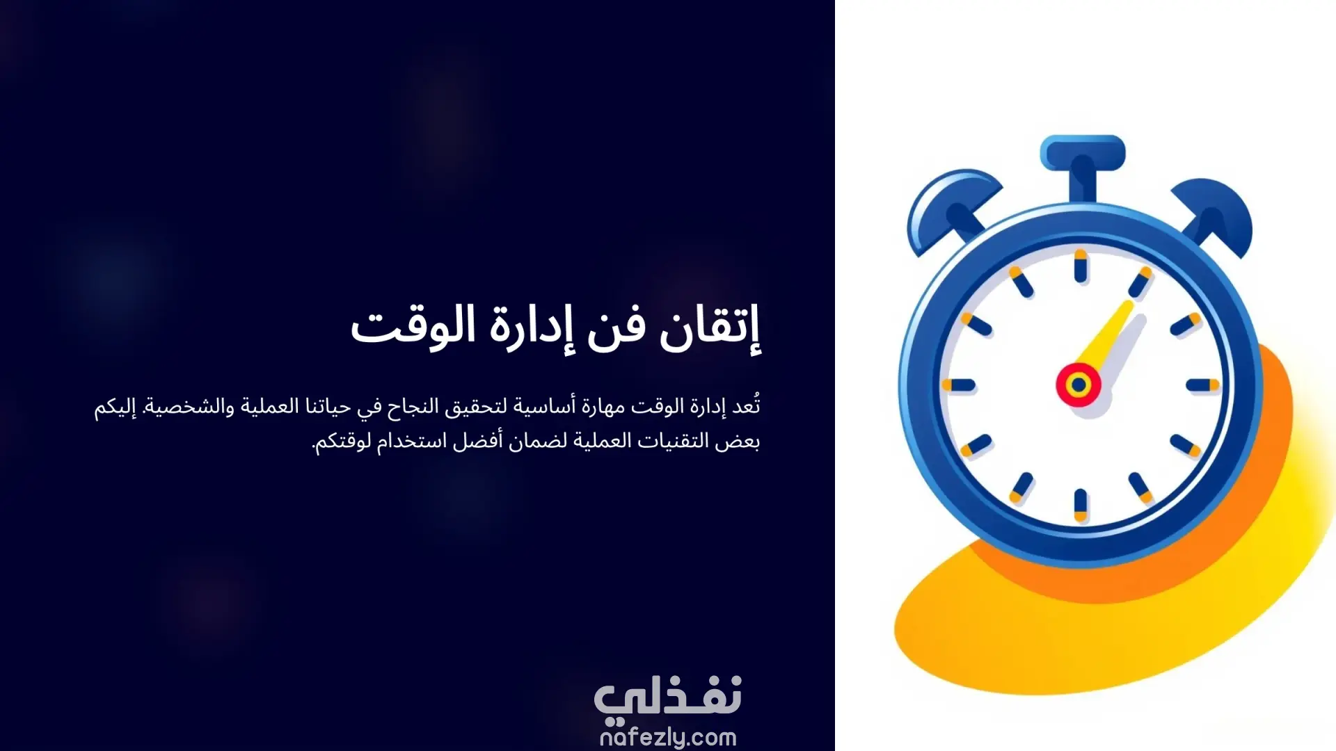 هذا التصميم هو جزء من عرض بصري احترافي يقدّم محتوى تعليمي مبسّط حول فن إدارة الوقت. يعتمد العمل على دمج واجهة داكنة أنيقة مع عناصر رسومية جذابة مثل الساعة التوضيحية، بهدف إيصال الفكرة بطريقة واضحة وجذابة. يتضمن التصميم: عنوان رئيسي قوي يوصل الفكرة مباشرة. نص تعريفي مختصر يوضّح أهمية إدارة الوقت ودورها في النجاح الشخصي والمهني. استخدام ألوان متناسقة (الأزرق الداكن + الأصفر) لخلق تباين بصري مميز. توزيع احترافي للعناصر بين النص والصورة لتحقيق توازن ممتاز في الواجهة. العمل مناسب لشرائح العروض التقديمية، المحتوى التعليمي، والكورسات الخاصة بالإنتاجية وتطوير الذات.