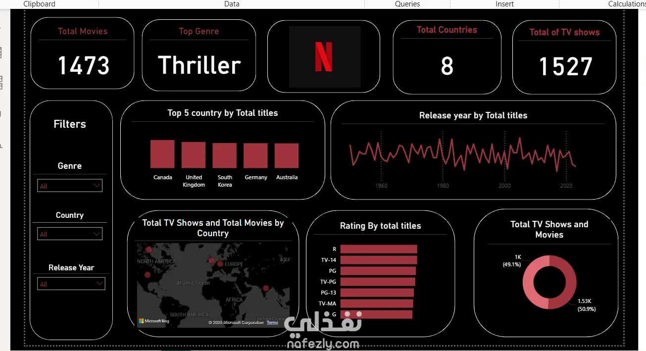 داش بورد تفاعلية تتضمن تحليل بيانات الأفلام والمسلسلات المتوفرة على منصة Netflix، وذلك بهدف فهم توزيع المحتوى واتجاهاته حسب النوع والدول وسنة الإصدار والتصنيفات العمرية. يعتمد المشروع على تصميم لوحة معلومات تفاعلية توضح أهم المؤشرات وتحويل البيانات المعقدة إلى رؤى واضحة وسهلة الفهم. تتضمن الـ Dashboard مجموعة من أهم المؤشرات الرئيسية، مثل: إجمالي عدد الأفلام والمسلسلات المتاحة على المنصة. أكثر الأنواع (Genres) انتشارًا على Netflix. عدد الدول المشاركة في إنتاج المحتوى. متوسط توزيع المحتوى بين Movies و TV Shows. كما تحتوي اللوحة على تحليلات تفصيلية توضح: Top 5 Countries من حيث عدد العناوين المتاحة. الاتجاه الزمني لإصدارات Netflix عبر السنوات. توزيع المحتوى حسب التقييمات العمرية (Ratings). مقارنة عدد الأفلام والمسلسلات حسب كل دولة من خلال خريطة تفاعلية. تتضمن اللوحة أيضًا فلاتر تفاعلية تسمح بتصفية البيانات حسب النوع، الدولة، وسنة الإصدار، مما يجعل التحليل مرنًا وسهل الاستخدام