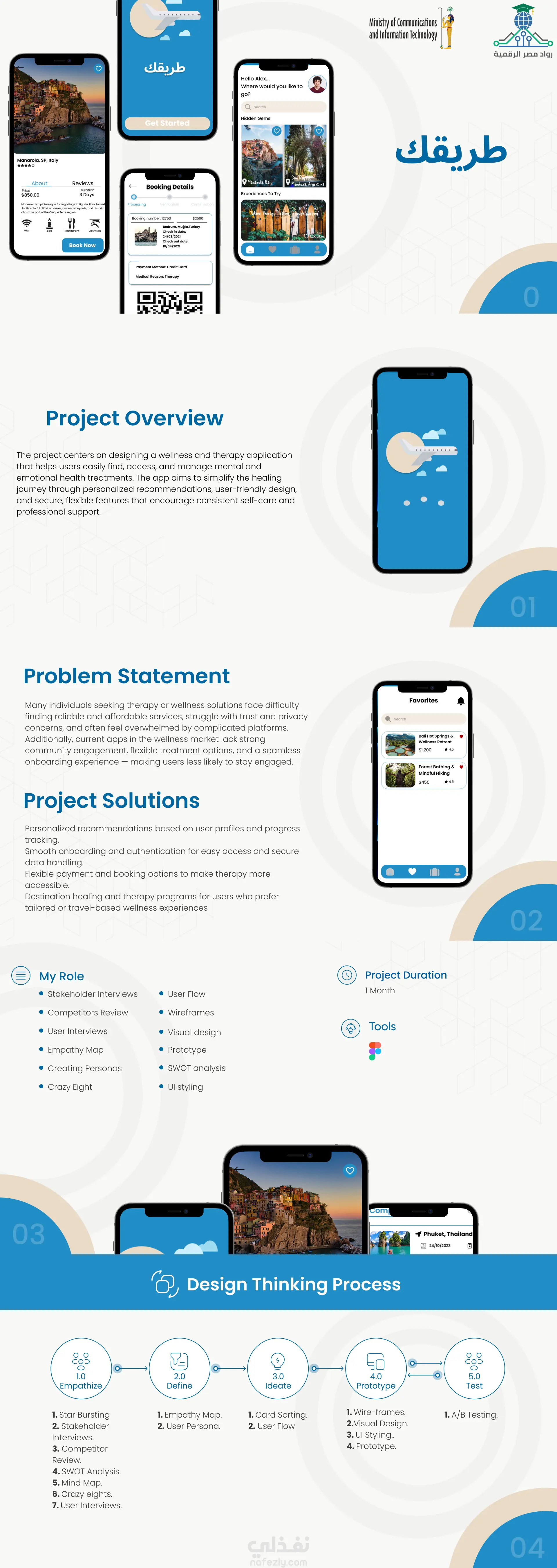 المشروع يركّز على تصميم تطبيق للعافية والعلاج يساعد المستخدمين في العثور بسهولة على العلاجات المتعلقة بالصحة النفسية والعاطفية، والوصول إليها، وإدارتها. يهدف التطبيق إلى تبسيط رحلة التعافي من خلال توصيات مخصّصة، وتصميم بسيط وسهل الاستخدام، وميزات آمنة ومرنة تشجّع على الاهتمام المستمر بالذات والحصول على الدعم المهني.