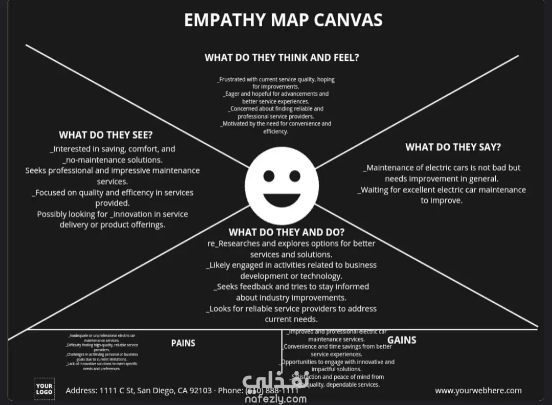توضح خريطة التعاطف دي أهم insights عن المستخدمين اللي بيعتمدوا على خدمات صيانة السيارات الكهربائية، وبتساعد في فهم احتياجاتهم، سلوكهم، توقعاتهم، والمشاكل اللي بيواجهوها، عشان نقدر نصمّم تجربة خدمة أفضل